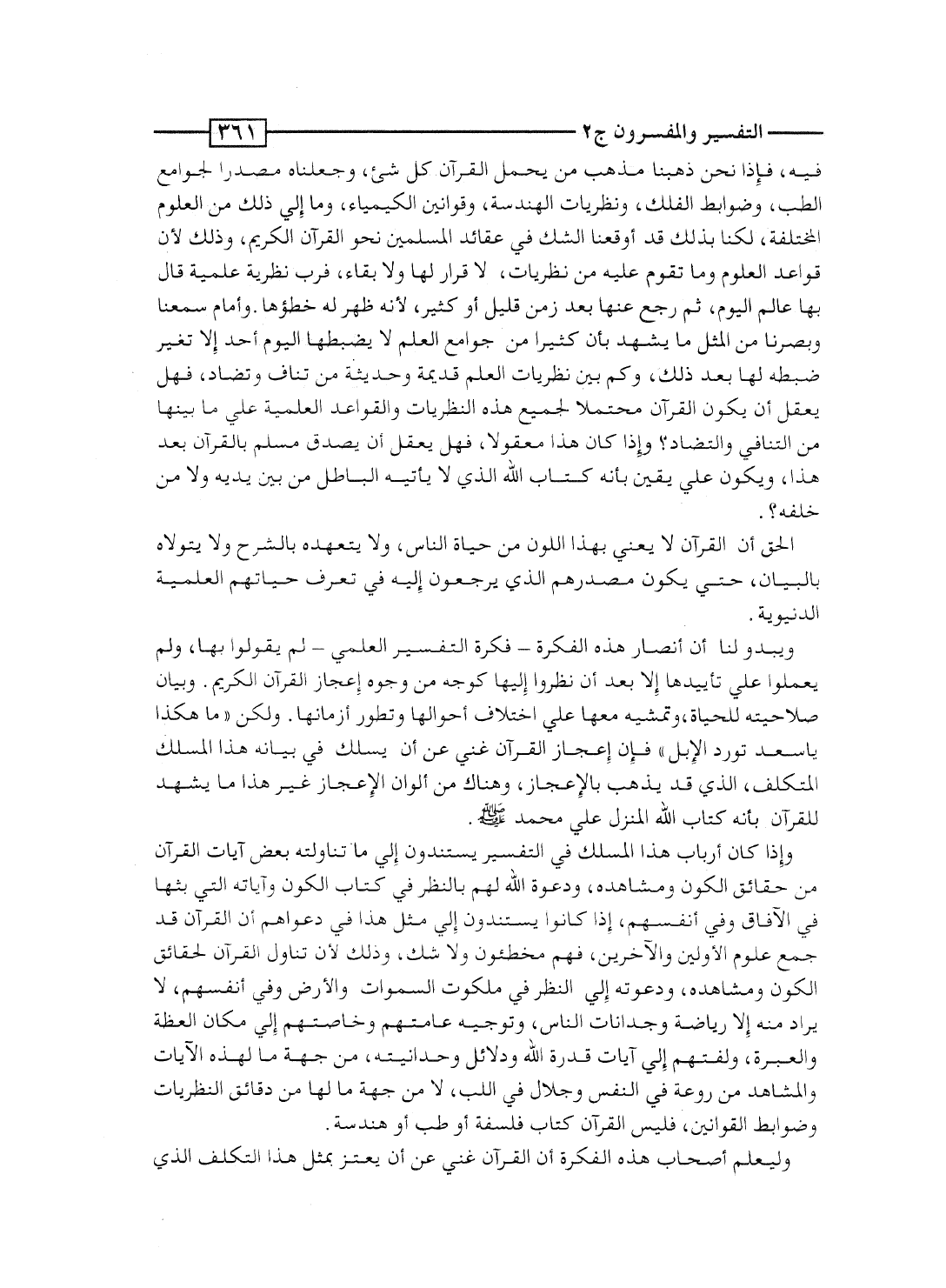 وإذا كان أرباب هذا المسلك فى التفسير يستندون إلى ما تناولته بعض آيات القرآن من حقائق الكون ومشاهده، ودعوة الله لهم بالنظر فى كتاب الكون وآياته التى بثًَّها فى الآفاق وفى أنفسهم، إذا كانوا يستندون إلى مثل هذا فى دعواهم أن القرآن قد جمع علوم الأوَّلين والآخرين، فهم مخطئون ولا شك، وذلك لأن تناول القرآن لحقائق الكون ومشاهده، ودعوته إلى النظر فى ملكوت السموات والأرض وفى أنفسهم، لا يُراد منه إلا رياضة وجدانات الناس، وتوجيه عامتهم وخاصتهم إلى مكان العظة والعبرة، ولفتهم إلى آيات قدرة الله ودلائل وحدانيته، من جهة ما لهذه الآيات والمشاهد من روعة فى النفس وجلال فى القلب، لا من جهة ما لها من دقائق النظريات وضوابط القوانين، فليس القرآن كتاب فلسفة أو طب أو هندسة.