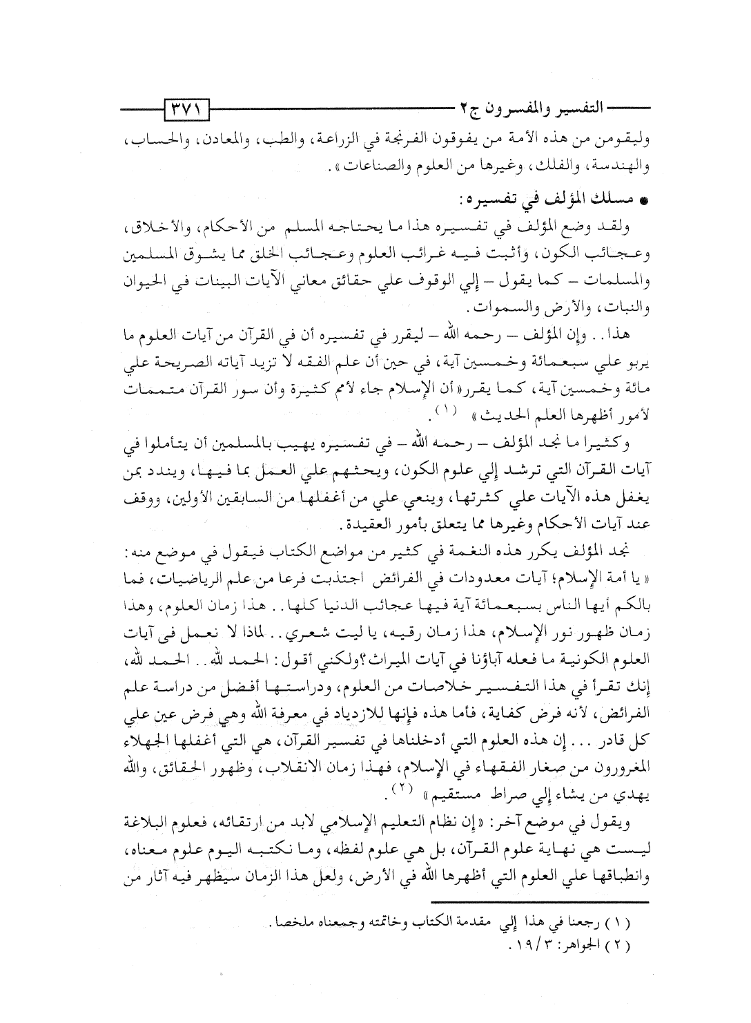 نجد المؤلف يكرر هذه النغمة فى كثير من مواضع الكتاب فيقول فى موضع منه: "يا أمة الإسلام؛ آيات معدودات فى الفرائض اجتذبت فرعاً من علم الرياضيات، فما بالكم أيها الناس بسبعمائة آية فيها عجائب الدنيا كلها.. هذا زمان العلوم، وهذا زمان ظهور نور الإسلام، هذا زمان رقيه، يا ليت شعرى.. لماذا لا نعمل فى آيات العلوم الكونية ما فعله آباؤنا فى آيات الميراث؟ ولكنى أقول: الحمد لله ... الحمد لله، إنك تقرأ فى هذا التفسير خلاصات من العلوم، ودراستها أفضل من دراسة علم الفرائض، لأنه فرض كفاية، فأما هذه فإنها للازدياد فى معرفة الله وهى فرض عَيْن على كل قادر ... إن هذه العلوم التى أدخلناها فى تفسير القرآن، هى التى أغفلها الجهلاء المغرورون من صغار الفقهاء فى الإسلام، فهذا زمان الانقلاب، وظهور الحقائق، والله يهدى مَن يشاء إلى صراط مستقيم".