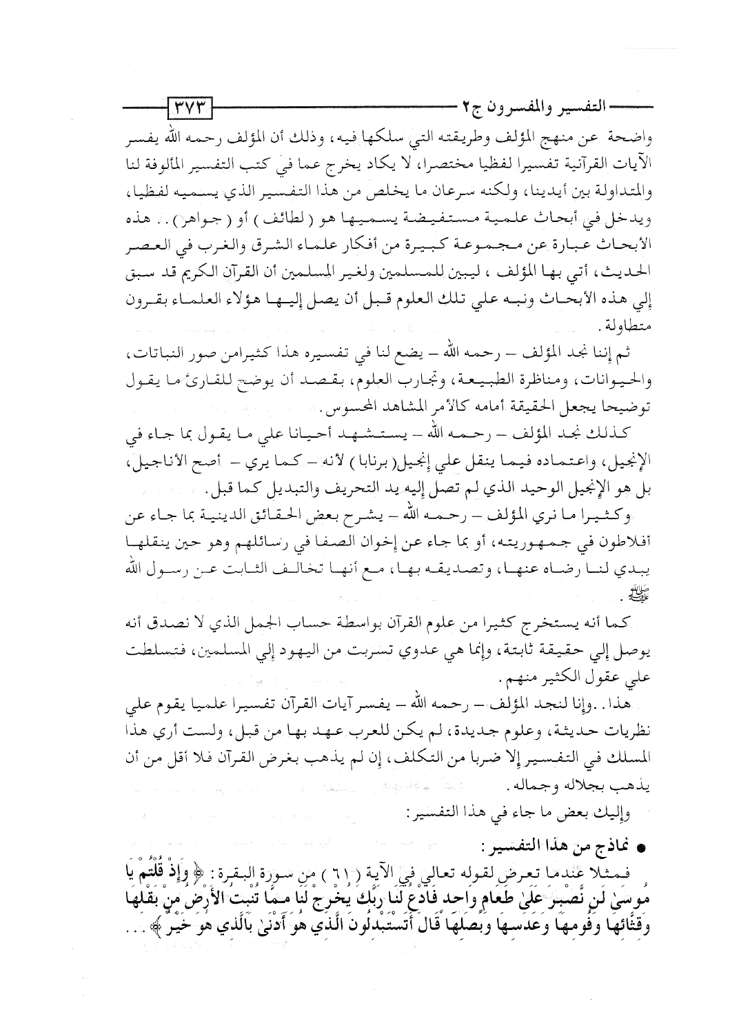 هذا.. وإنَّا لنجد المؤلف - رحمه الله - يُفسِّر آيات القرآن تفسيراً علمياً يقوم على نظريات حديثة، وعلوم جديدة، لم يكن للعرب عهد بها من قبل، ولست أرى هذا المسلك فى التفسير إلا ضرباً من التكلف، إن لم يذهب بغرض القرآن، فلا أقل من أن يُذهب بجلاله وجماله.