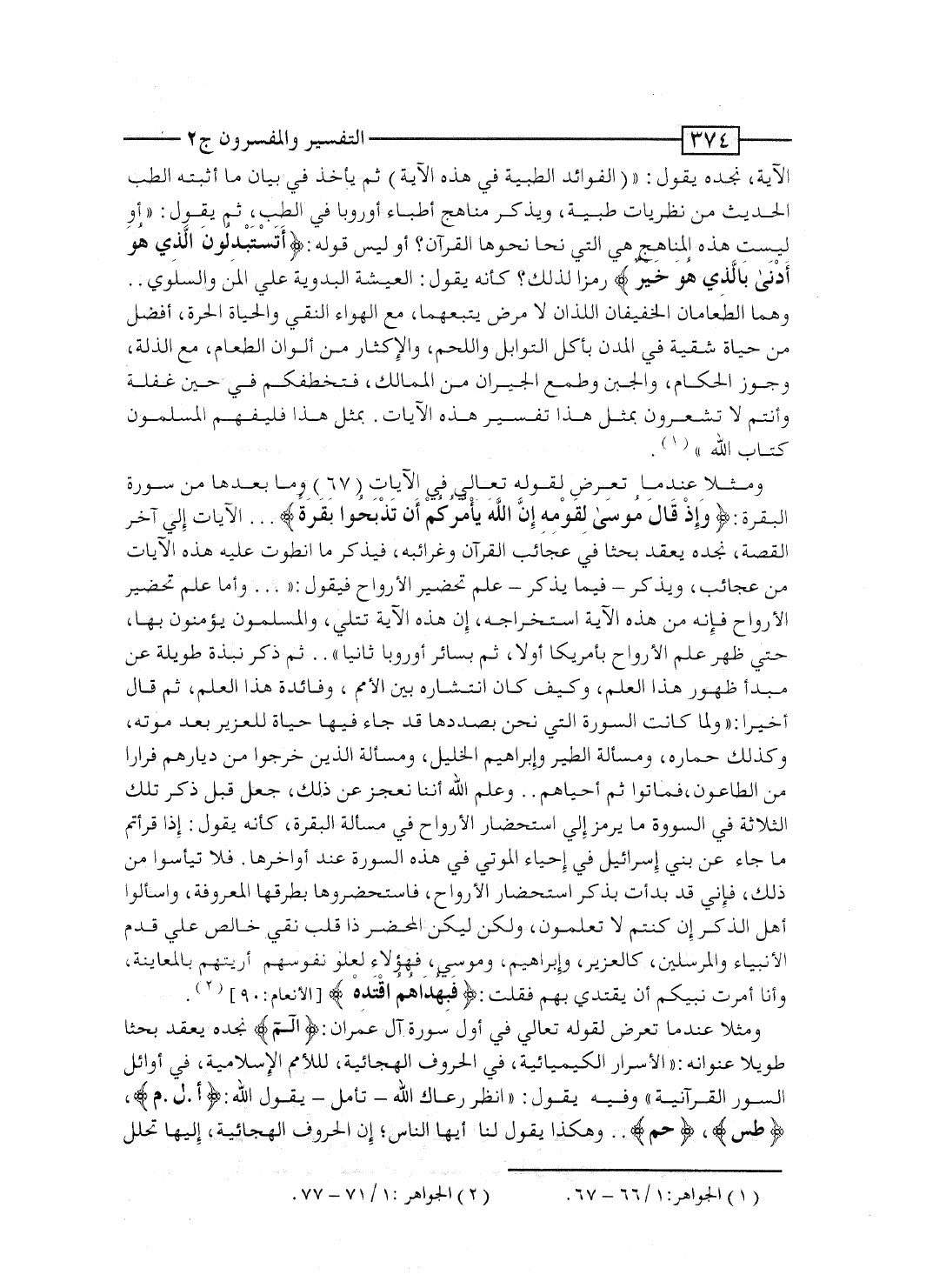 الآية، نجده يقول: "الفوائد الطيبة فى هذه الآية" ثم يأخذ فى بيان ما أثبته الطب الحديث من نظريات طبية، ويذكر مناهج أطباء أوروبا فى الطب، ثم يقول: "أَوَ ليست هذه المناهج هى التى نحا نحوها القرآن؟ أَوَ ليس قوله: {أَتَسْتَبْدِلُونَ الذي هُوَ أدنى بالذي هُوَ خَيْرٌ} رمزاً لذلك؟ كأنه يقول: العيشة البدوية على المن والسلوى ... وهما الطعامان الخفيفان اللذان لا مرض يتبعهما، مع الهواء النقى والحياة الحرة، أفضل من حياة شقية فى المدن بأكل التوابل، واللحم، والإكثار من ألوان الطعام، مع الذلة، وجور الحكام، والجبن، وطمع الجيران من الممالك، فتختطفكم فى حين غفلة وأنتم لا تشعرون. بمثل هذا تُفسِّر هذه الآيات. بمثل هذا فليفهم المسلمون كتاب الله".