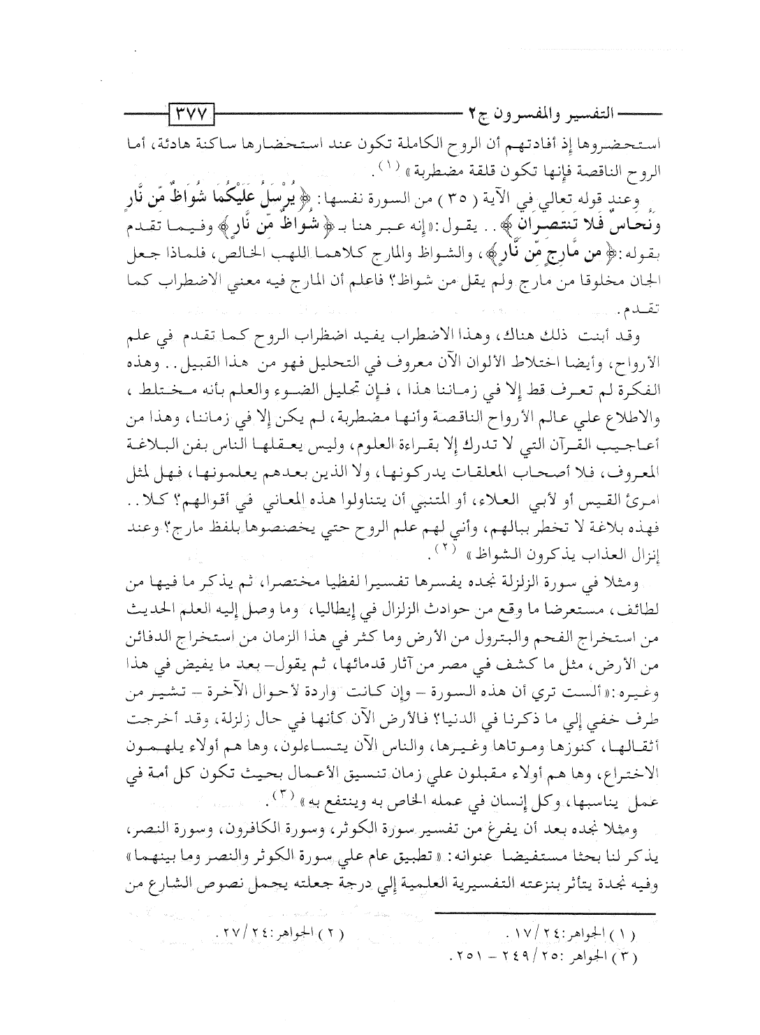 وقد أنبت ذلك هناك، وهذا الاضطراب يفيد اضطراب الروح كما تقدم فى علم الأرواح، وأيضاً اختلاط الألوان الآن معروف فى التحليل فهو من هذا القبيل.. وهذه الفكرة لم تُعرف قط إلا فى زماننا هذا، فإن تحليل الضوء والعلم بأنه مختلط، والاطلاع على عالم الأرواح الناقصة وأنها مضطربة، لم يكن إلا فى زماننا، وهذا من أعاجيب القرآن التى لا تُدرك إلا بقراءة العلوم، وليس يعقلها الناس بفن البلاغة المعروف، فلا أصحاب المعلقات يدركونها، ولا الذين بعدهم يعلمونها، فهل لمثل امرىء القيس، أو لأبى العلاء، أو المتنبى أن يتناولوا هذه المعانى فى أقوالهم؟ كلا.. فهذه البلاغة لا تخطر ببالهم، وأنَّى لهم علم الروح حتى يخصصوها بلفظ مارج؟ وعند إنزال العذاب يذكرون الشواظ".