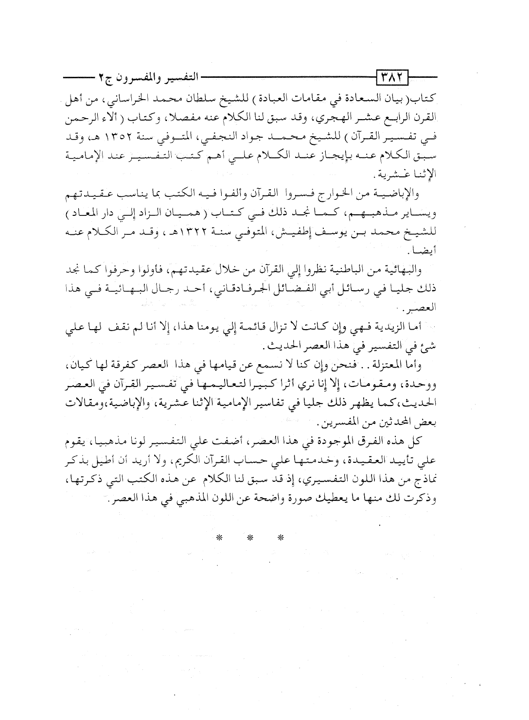 كتاب "بيان السعادة فى مقامات العبادة" للشيخ سلطان محمد الخراسانى، من أهل القرن الرابع عشر الهجرى، وقد سبق لنا الكلام عنه مفصَّلاً، وكتاب "آلاء الرحمن فى تفسير القرآن" للشيخ محمد جواد النجفى، المتوفى سنة 1352 هـ، وقد سبق الكلام عنه بإيجاز عند الكلام على أهم كتب التفسير عند الإمامية الإثنا عشرية.