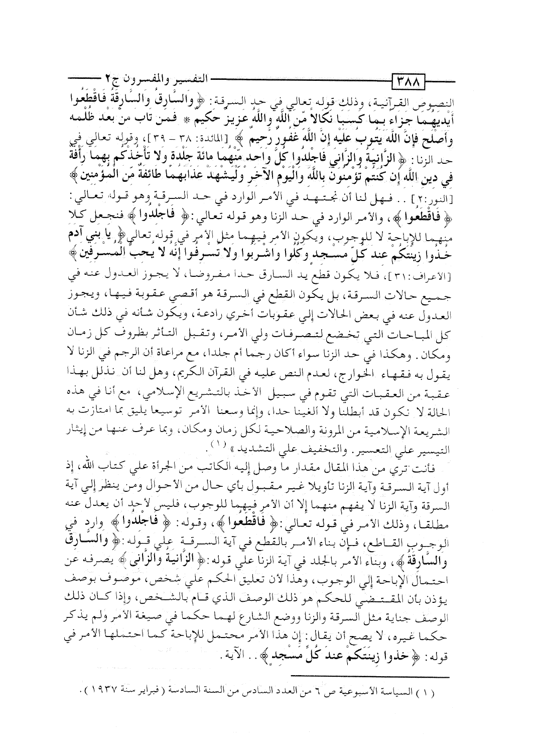 فأنت ترى من هذا المقال مقدار ما وصل إليه الكاتب من الجرأة على كتاب الله، إذ أوَّل آية السرقة وآية الزنا تأويلاً غير مقبول بأى حال من الأحوال، ومَن ينظر إلى آية السرقة وآية الزنا لا يفهم منهما إلا أن الأمر فيهما للوجوب، فليس لأحد أن يعدل عنه مطلقاً، وذلك الأمر فى قوله تعالى: {فاقطعوا} ، وقوله: {فاجلدوا} وارد فى الوجوب القاطع، فإن بناء الأمر بالقطع فى آية السرقة على قوله: {والسارق والسارقة} ، وبناء الأمر بالجلد فى آية الزنا على قوله: {الزانية والزاني} يصرفه عن احتمال الإباحة إلى الوجوب، وهذا لأن تعليق الحكم على شخص، موصوف بوصف يؤذن بأن المقتضى للحكم هو ذلك الوصف الذى قام بالشخص، وإذا كان ذلك الوصف جناية مثل السرقة والزنا ووضع الشارع لهما حكماً فى صيغة الأمر ولم يذكر حكماً غيره، لا يصح أن يُقال: إن هذا الأمر محتمل للإباحة كما احتملها الأمر فى قوله: {خُذُوا زِينَتَكُمْ عِنْدَ كُلِّ مَسْجِدٍ} ... الآية.