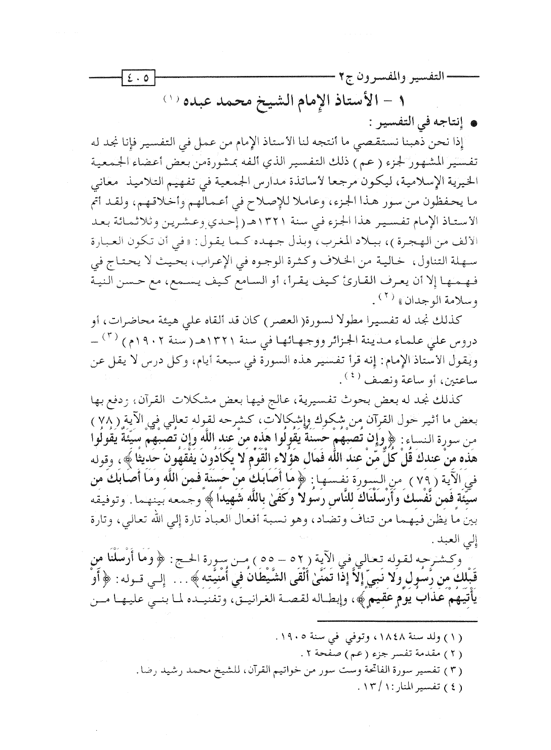 كذلك نجد له تفسيراً مطوَّلاً لسورة "العصر" كان قد ألقاه على هيئة محاضرات، أو دروس على علماء مدينة الجزائر ووجهائها فى سنة 1321 هـ (سنة 1902م) - ويقول الأستاذ الإمام: إنه قرأ تفسير هذه السورة فى سبعة أيام، وكل درس لا يقل عن ساعتين، أو ساعة ونصف.