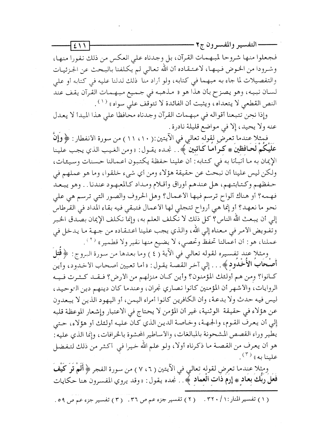 فجعلوا منها شروحاً لمبهمات القرآن، بل وجدناه على العكس من ذلك نفوراً منها، وشروداً من الخوض فيها، لاعتقاده أن الله تعالى لم يكلفنا بالبحث عن الجزئيات والتفصيلات لما جاء به مبهماً فى كتابه، ولو أراد منا ذلك لدلنا عليه فى كتابه أو على لسان نبيه، وهو يُصَرِّح بأن هذا هو "مذهبه فى جميع مبهمات القرآن يقف عند النص القطعى لا يتعداه، ويثبت أن الفائدة لا تتوقف على سواه".