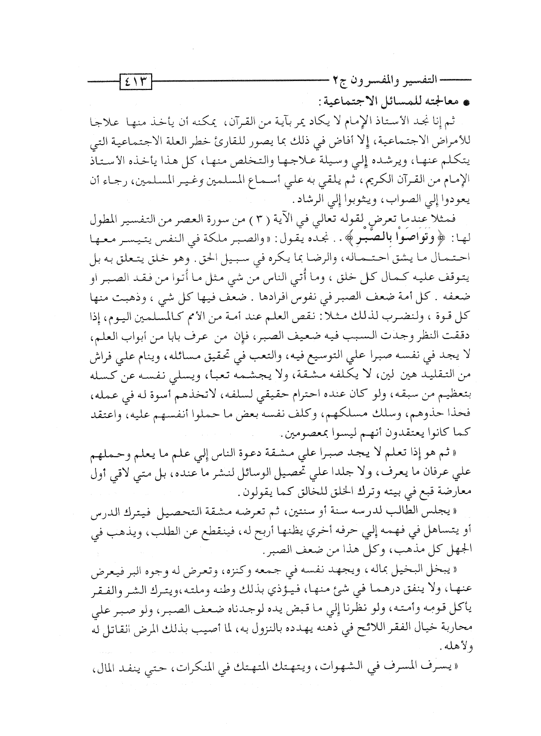 فمثلاً عندما تعرَّض لقوله تعالى فى الآية [3] من سورة العصر من التفسير المطوَّل لها: {وَتَوَاصَوْاْ بالصبر} .. نجده يقول: "والصبر مَلَكة في النفس يتيسر معها احتمال ما يشق احتماله، والرضا بما يكره فى سبيل الحق. وهو خُلُق يتعلق به بل يتوقف عليه كمال كل خُلُق، وما أُتِىَ الناس من شىء مثل ما أُتوا من فقد الصبر أو ضعفه. كل أُمة ضعف الصبر فى نفوس أفرادها. ضعف فيها كل شىء، وذهبت منها كل قوة، ولنضرب لذلك مثلاً: نقص العلم عند أمة من الأمم كالمسلمين اليوم، إذا دققت النظر وجدت السبب فيه ضعف الصبر، فإن مَن عرف باباً من أبواب العلم، لا يجد فى نفسه صبراً على التوسع فيه، والتعب فى تحقيق مسائله، وينام على فراش من التقليد هَيِّن لَيِّن، لا يكلفه مشقة، ولا يجشمه تعبأ، ويسلى نفسه عن كسله بتعظيم مَن سبقه، ولو كان عنده احترام حقيقى لسَلَفه، لاتخذهم أُسوة له فى عمله، فحذا حذوهم، وسلك مسلكهم، وكلَّف نفسه بعض ما حملوا أنفسهم عليه، واعتقد كما كانوا يعتقدون أنهم ليسوا بمعصومين.