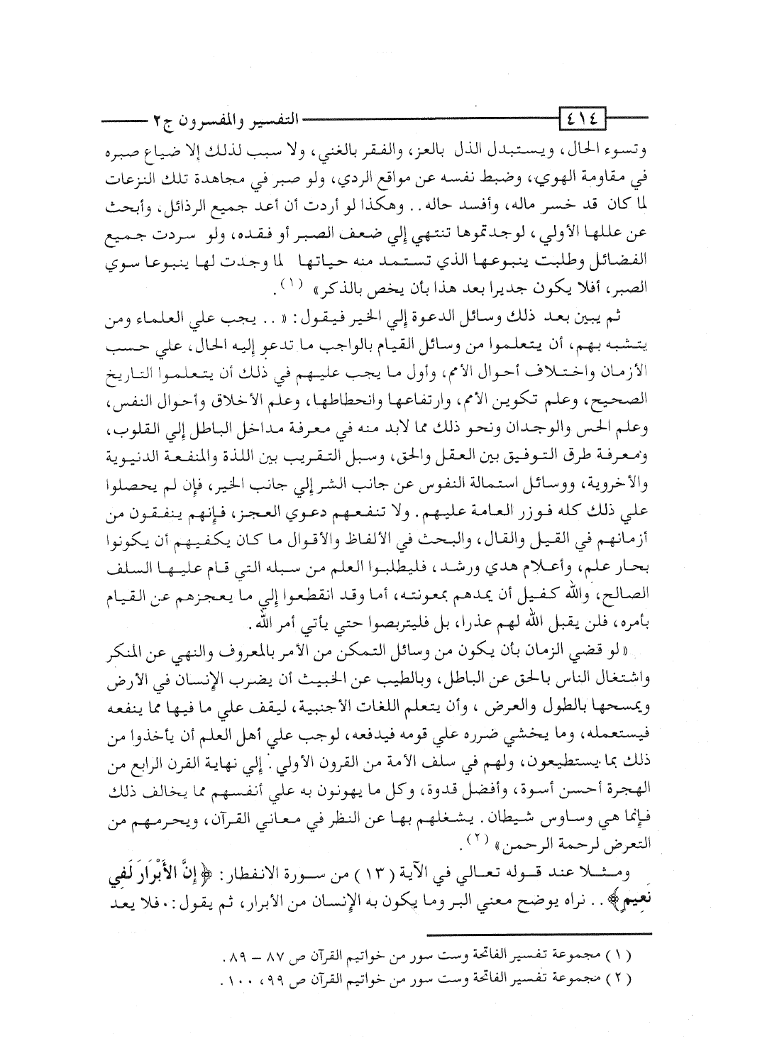 ومثلاً عند قوله تعالى فى الآية [13] من سورة الانفطار: {إِنَّ الأبرار لَفِي نَعِيمٍ} .. نراه يوضح معنى البِّر وما يكون به الإنسان من الأبرار، ثم يقول: "فلا يُعَد