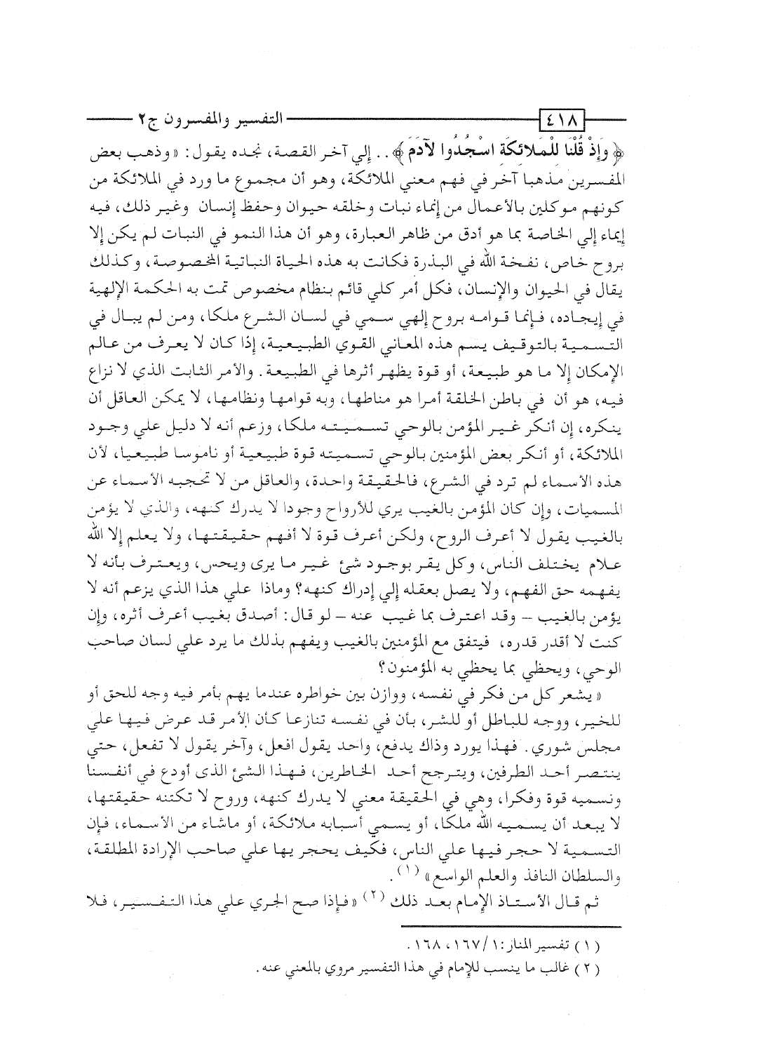 {وَإِذْ قُلْنَا لِلْمَلاَئِكَةِ اسجدوا لأَدَمََ} ... إلى آخر القصة، نجده يقول: "وذهب بعض المفسِّرين مذهباً آخر فى فهم معنى الملائكة، وهو أن مجموع ما ورد فى الملائكة من كونهم موكلين بالأعمال من إنماء نبات وخِلْقة حيوان وحفظ إنسان وغير ذلك، فيه إيماء إلى الخاصة بما هو أدق من ظاهر العبارة، وهو أن هذا النمو فى النبات لم يكن إلا بروح خاص، نفخه الله فى البذرة فكانت به هذه الحياة النباتية المخصوصة، وكذلك يقال فى الحيوان والإنسان، فكل أمر كلى قائم بنظام مخصوص تمت به الحكمة الإلهية فى إيجاده، فإنما قوامه بروح إلهى سُمِّى فى لسان الشرع مَلَكاً، ومَن لم يبال فى التسمية بالتوقيف يسم هذه المعانى القوى الطبيعية، إذا كان لا يعرف من عالَم الإمكان إلا ما هو طبيعة، أو قوة يظهر أثرها فى الطبيعة. والأمر الثابت الذى لا نزاع فيه، هو أن فى باطن الخِلْقة أمراً هو مناطها، وبه قوامها ونظامها، لا يمكن العاقل أن ينكره، إن أنكر غير المؤمن بالوحى تسميته مَلَكاً، وزعم أنه لا دليل على وجود الملائكة، أو أنكر بعض المؤمنين بالوحى تسميته قوة طبيعية أو ناموساً طبيعياً، لأن هذه الأسماء لم ترد فى الشرع، فالحقيقة واحدة، والعاقل مَن لا تحجبه الأسماء عن المسميات، وإن كان المؤمن بالغيب يرى للأرواح وجوداً لا يدرك كنهه، والذى لا يؤمن بالغيب يقول لا أعرف الروح، ولكن أعرف قوة لا أفهم حقيقتها، ولا يعلم إلا الله علام يختلف الناس، وكلٌ يقر بوجود شىء غير ما يرى ويحس، ويعترف بأنه لا يفهمه حق الفهم، ولا يصل بعقله إلى إدراك كنهه؟ وماذا على هذا الذى يزعم أنه لا يؤمن بالغيب - وقد اعترف بما غيب عنه - لو قال: أُصدِّق بغيب أعرف أثره، وإن كنت لا أُقدِّر قدره، فيتفق مع المؤمنين بالغيب، ويفهم بذلك ما يرد على لسان صاحب الوحى، ويحظى بما يحظى به المؤمنون؟