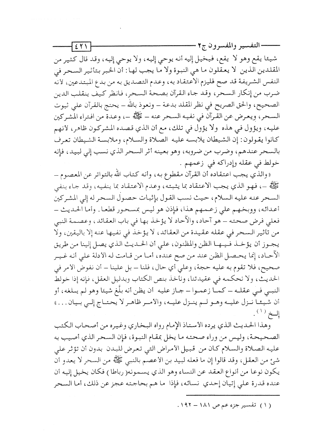 "والذى يجب اعتقاده أن القرآن مقطوع به، وأنه كتاب الله بالتواتر عن المعصوم - صلى الله عليه وسلم -، فهو الذى يجب الاعتقاد بما يُثبته، وعدم الاعتقاد بما يُنفيه، وقد جاء بنفى السحر عنه عليه السلام، حيث نسب القول بإثبات حصول السحر له إلى المشركين أعدائه، ووبخهم على زعمهم هذا، فإذن هو ليس بمسحور قطعاً. وأما الحديث - فعلى فرض صحته - هو آحاد، والآحاد لا يؤخذ بها فى باب العقائد، وعصمة النبى من تأثير السحر فى عقله عقيدة من العقائد، لا يؤخذ فى نفيها عنه إلا باليقين، ولا يجوز أن يؤخذ فيها الظن والمظنون، عل أن الحديث الذى يصل إلينا من طريق الآحاد، إنما يحصل الظن عند مَن صح عنده، أما مَن قامت له الأدلة على أنه غير صحيح، فلا تقوم به عليه حُجَّة، وعلى أى حال، فلنا - بل علينا - أن نُفوِّض الأمر فى الحديث. ولا نُحَكِّمه فى عقيدتنا، ونأخذ بنص الكتاب وبدليل العقل، فإنه إذا خولط النبى فى عقله - كما زعموا - جاز عليه أن يظن أنه بَلَّغ شيئاً وهو لم يُبَلِّغه، أو أن شيئاً نزل عليه وهو لم ينزل عليه، والأمر ظاهر لا يحتاج إلى بيان.. " إلخ.