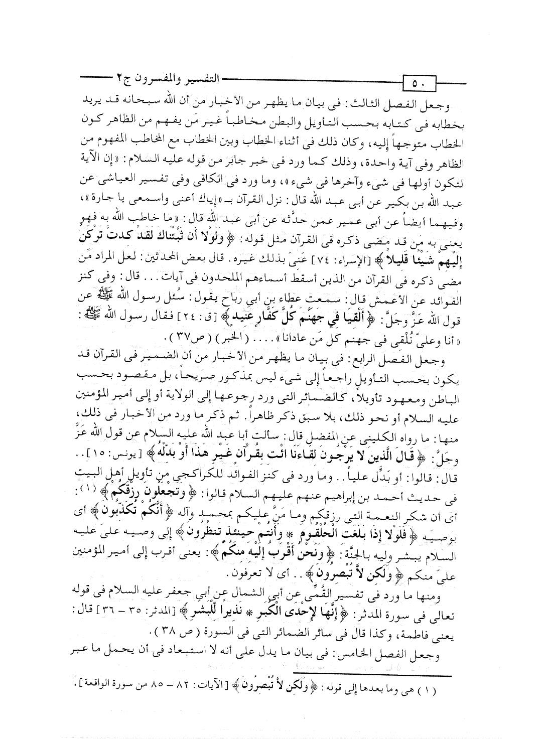 وجعل الفصل الرابع: فى بيان ما يظهر من الأخبار من أن الضمير فى القرآن قد يكون بحسب التأويل راجعاً إلى شئ ليس بمذكور صريحاً، بل مقصود بحسب الباطن ومعهود تأويلاً، كالضمائر التى ورد رجوعها إلى الولاية أو إلى أمير المؤمنين عليه السلام أو نحو ذلك، بلا سبق ذكر ظاهراً. ثم ذكر ما ورد من الأخبار فى ذلك، منها: ما رواه الكلينى عن المفضل قال: سألت أبا عبد الله عليه السلام عن قول الله عَزَّ وجَلَّ: {قَالَ الذين لاَ يَرْجُونَ لِقَآءَنَا ائت بِقُرْآنٍ غَيْرِ هاذآ أَوْ بَدِّلْهُ} [يونس: 15] .. قال: قالوا: أو بَدِّل علياً.. وما ورد فى كنز الفوائد للكراكجى من تأويل أهل البيت فى حديث أحمد بن إبراهيم عنهم عليهم السلام قالوا: {وَتَجْعَلُونَ رِزْقَكُمْ} [الواقعة: 82] : أى أن شكر النعمة التى رزقكم وما مَنَّ عليكم بمحمد وآله {أَنَّكُمْ تُكَذِّبُونَ} أى بوصيه {فَلَوْلاَ إِذَا بَلَغَتِ الحلقوم * وَأَنتُمْ حِينَئِذٍ تَنظُرُونَ} إلى وصيه علىّ عليه السلام يبشر وليه بالجنَّة: {وَنَحْنُ أَقْرَبُ إِلَيْهِ مِنكُمْ} : يعنى أقرب إلى أمير المؤمنين علىّ منكم {ولاكن لاَّ تُبْصِرُونَ} .. أى لا تعرفون.