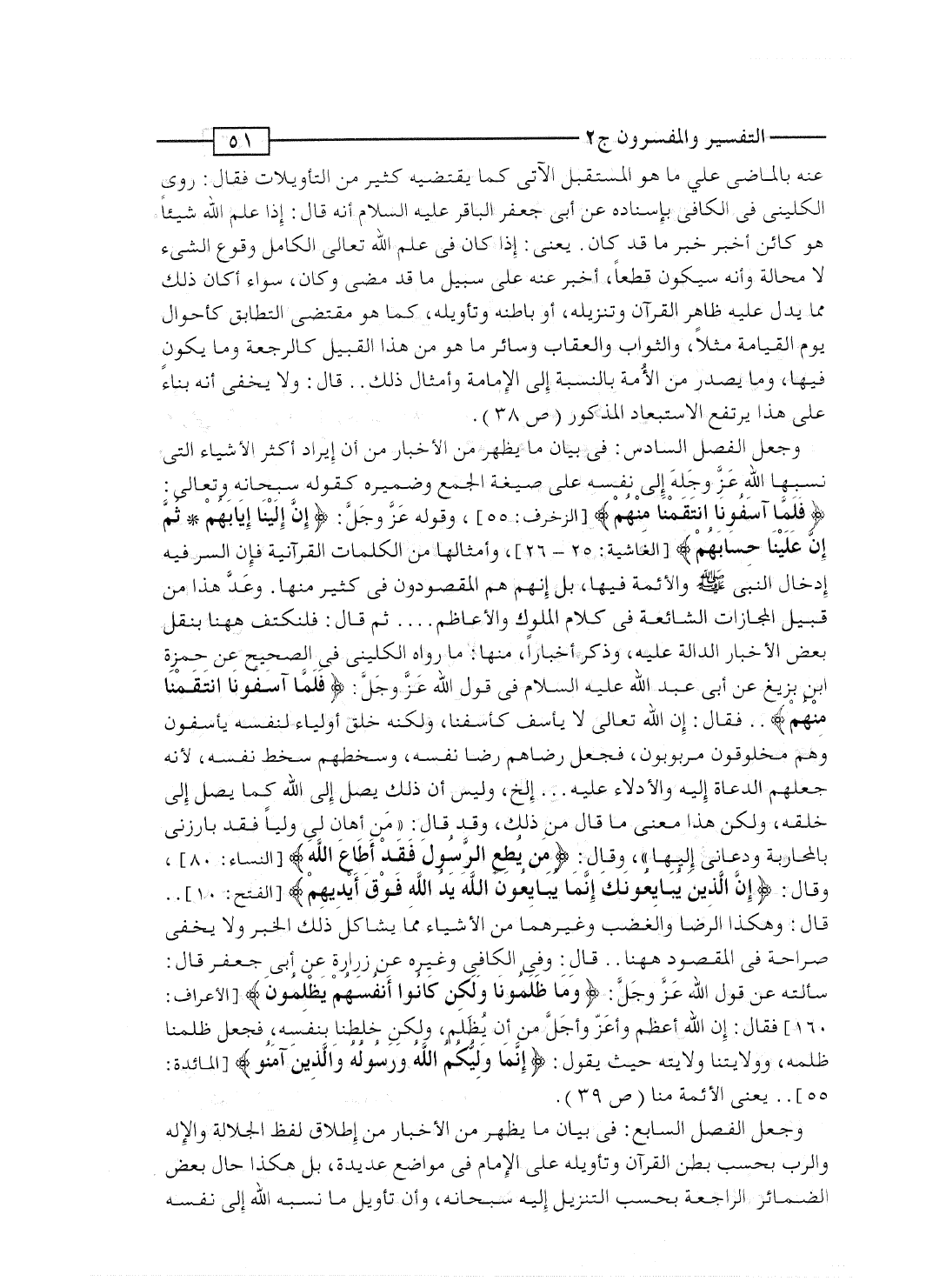 وجعل الفصل السادس: فى بيان ما يظهر من الأخبار من أن إيراد أكثر الأشياء التى نسبها الله عَزَّ وجَلَّ إلى نفسه على صيغة الجمع وضميره كقوله سبحانه وتعالى: {فَلَمَّآ آسَفُونَا انتقمنا مِنْهُمْ} [الزخرف: 55] ، وقوله عَزَّ وجَلَّ: {إِنَّ إِلَيْنَآ إِيَابَهُمْ * ثُمَّ إِنَّ عَلَيْنَا حِسَابَهُمْ} [الغاشية: 25-26] ، وأمثالها من الكلمات القرآنية فإن السر فيه إدخال النبى صلى الله عليه وسلم والأئمة فيها، بل إنهم هم المقصودون فى كثير منها. وعَدَّ هذا من قبيل المجازات الشائعة فى كلام الملوك والأعاظم ... ثم قال: فلنكتف ههنا بنقل بعض الأخبار الدالة عليه، وذكر أخباراً، منها: ما رواه الكلينى فى الصحيح عن حمزة بن بزيغ عن أبى عبد الله عليه السلام فى قول الله عَزَّ وجَلَّ: {فَلَمَّآ آسَفُونَا انتقمنا مِنْهُمْ} .. فقال: إن الله تعالى لا يأسف كأسفنا، ولكنه خلق أولياء لنفسه يأسفون وهم مخلوقون مربوبون، فجعل رضاهم رضا نفسه، وسخطهم سخط نفسه، لأنه جعلهم الدعاة إليه والأدلاء عليه ... إلخ، وليس أن ذلك يصل إلى الله كما يصل إلى خلقه، ولكن هذا معنى ما قال من ذلك، وقد قال: "مَن أهان لى ولياً فقد بارزنى بالمحاربة ودعانى إليها"، وقال: {مَّنْ يُطِعِ الرسول فَقَدْ أَطَاعَ الله} [النساء: 80] ، وقال: {إِنَّ الذين يُبَايِعُونَكَ إِنَّمَا يُبَايِعُونَ الله يَدُ الله فَوْقَ أَيْدِيهِمْ} [الفتح: 10] .. قال: وهكذا الرضا والغضب وغيرهما من الأشياء مما يشاكل ذلك الخبر ولا يخفى صراحة فى المقصود ههنا.. قال: وفى الكافى وغيره عن زرارة عن أبى جعفر قال: سألته عن قول الله عَزَّ وجَلَّ: {وَمَا ظَلَمُونَا ولاكن كانوا أَنْفُسَهُمْ يَظْلِمُونَ} [الأعراف: 160] فقال: إن الله أعظم وأعَزّ وأجَلّ من أن يُظلم، ولكن خلطنا بنفسه، فجعل ظلمنا ظلمه، وولايتنا ولايته حيث يقول: {إِنَّمَا وَلِيُّكُمُ الله وَرَسُولُهُ والذين آمَنُواْ} [المائدة: 55] .. يعنى الأئمة منا (ص 39) .