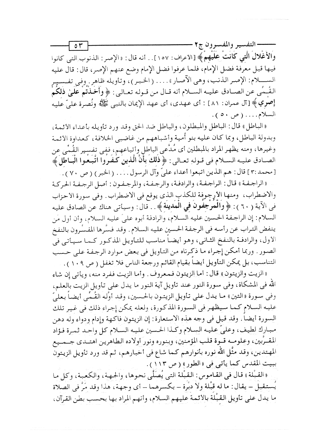 والأغلال التي كَانَتْ عَلَيْهِمْ} [الأعراف: 157] .. أنه قال: "الإصر: الذنوب التى كانوا فيها قبل معرفة فضل الإمام، فلما عرفوا فضل الإمام وضع عنهم الإصر، قال: قال عليه السلام: الإصر الذنب، وهى الآصار" ... (الخبر) ، وتأويله ظاهر. وفى تفسير القُمِّى عن الصادق عليه السلام أنه قال من قوله تعالى: {وَأَخَذْتُمْ على ذلكم إِصْرِي} [آل عمران: 81] : أى عهدى، أى عهد الإيمان بالنبى صلى الله عليه وسلم ونُصرة علىّ عليه السلام ... . (ص 50) .