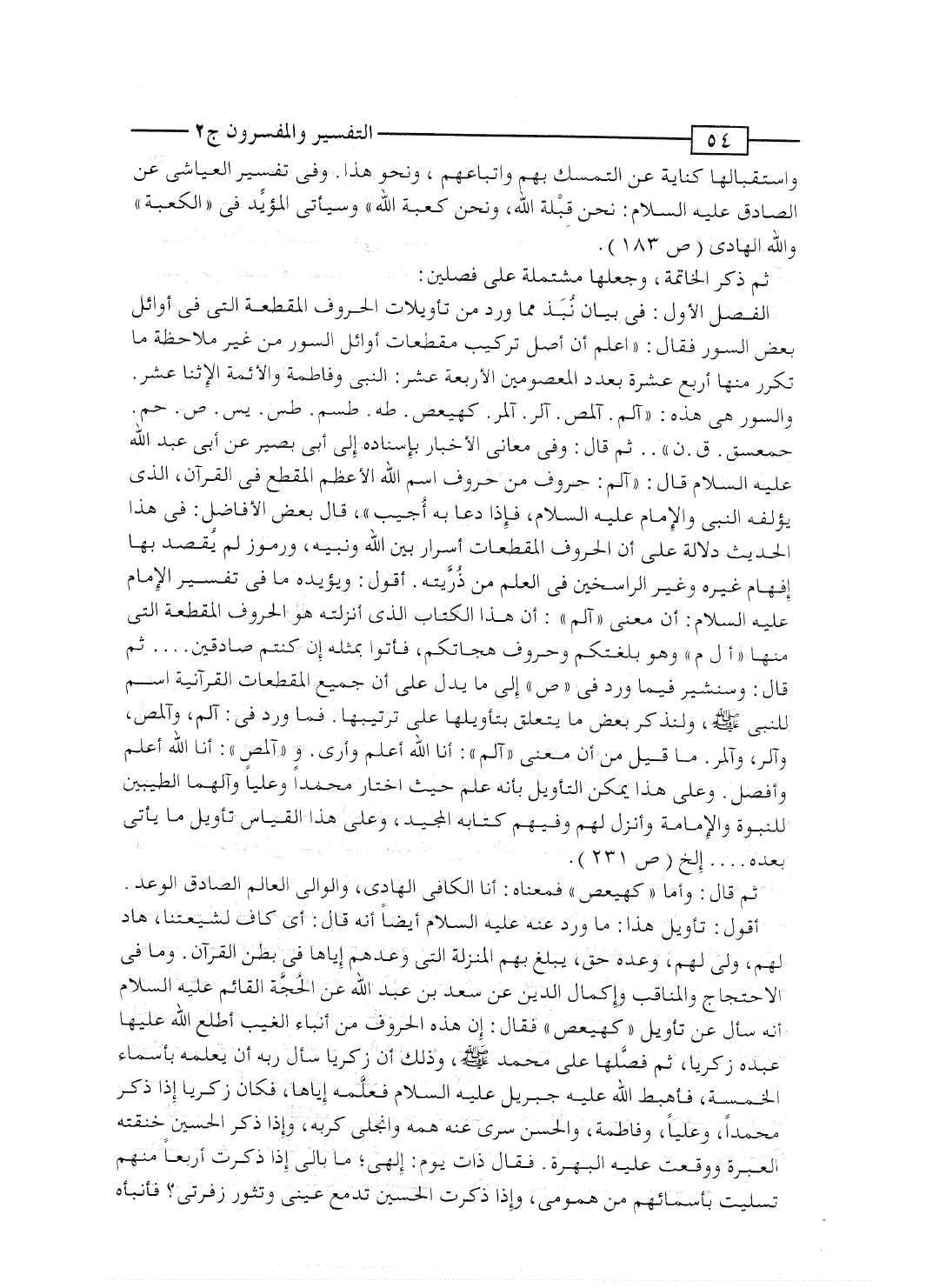 الفصل الأول: فى بيان نُبَذ مما ورد من تأويلات الحروف المقطعة التى فى أوائل بعض السور فقال: "اعلم أن أصل تركيب مقطعات أوائل السور من غير ملاحظة ما تكرر منها أربع عشرة بعدد المعصومين الأربعة عشر: النبى وفاطمة والأئمة الإثنا عشر. والسور هى هذه: "آلم. آلمص. آلر. آلمر. كهيعص. طه. طسم. طس. يس. ص. حم. حمعسق. ق. ن".. ثم قال: وفى معانى الأخبار بإسناده إلى أبى بصير عن أبى عبد الله عليه السلام قال: "آلم: حروف من حروف اسم الله الأعظم المقطع فى القرآن، الذى يؤلفه النبى والإمام عليه السلام، فإذا دعا به أُجيب"، قال بعض الأفاضل: فى هذ الحديث دلالة على أن الحروف المقطعات أسرار بين الله ونبيه، ورموز لم يُقصد بها إفهام غيره وغير الراسخين فى العلم من ذُرِّيته. أقول: ويؤيده ما فى تفسير الإمام عليه السلام: أن معنى "آلم": أن هذا الكتاب الذى أنزلته هو الحروف المقطعة التى منها "أل م" وهو بلغتكم وحروف هجائكم، فأتوا بمثله إن كنتم صادقين ... ثم قال: وسنشير فيما ورد فى "ص" إلى ما يدل على أن جميع المقطعات القرآنية اسم للنبى صلى الله عليه وسلم، ولنذكر بعض ما يتعلق بتأويلها على ترتيبها. فما ورد فى: آلم، وآلمص، وآلر، وآلمر. ما قيل من أن معنى "آلم": أنا الله أعلم وأرى. و "آلمص": أنا الله أعلم وأفصل. وعلى هذا يمكن التأويل بأنه علم حيث اختار محمداً وعلياً وآلهماً الطيبين للنبوة والإمامة وأنزل لهم وفيهم كتابه المجيد، وعلى هذا القياس تأويل ما يأتى بعده ... . إلخ" (ص 231) .