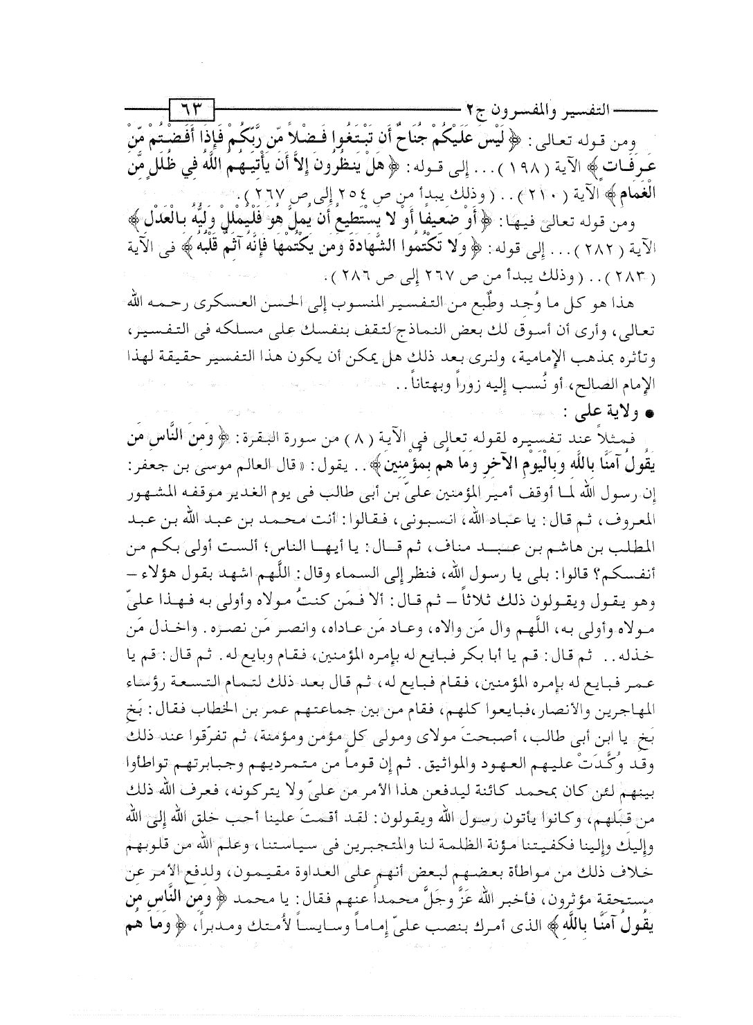 فمثلاً عند تفسيره لقوله تعالى فى الآية [8] من سورة البقرة: {وَمِنَ الناس مَن يَقُولُ آمَنَّا بالله وباليوم الآخر وَمَا هُم بِمُؤْمِنِينَ} .. يقول: "قال العالم موسى بن جعفر: إن رسول الله لما أوقف أمير المؤمنين علىّ ابن أبى طالب فى يوم الغدير موقفه المشهور المعروف، ثم قال: يا عباد الله؛ انسبونى، فقالوا: أنت محمد بن عبد الله بن عبد المطلب بن هاشم ابن عبد مناف، ثم قال: يا أيها الناس؛ ألست أولى بكم من أنفسكم؟ قالوا: بلى يا رسول الله، فنظر إلى السماء وقال: اللَّهم اشهد بقول هؤلاء - وهو يقول ويقولون ذلك ثلاثاً - ثم قال: ألا فمَن كنتُ مولاه وأولى به فهذا علىّ مولاه وأولى به، اللَّهم وال مَن والاه، وعاد مَن عاداه، وانصر مَن نصره. واخذل من خذله.. ثم قال: قم يا أبا بكر فبايع له بإمرة المؤمنين، فقام وبايع له. ثم قال: قم يا عمر فبايع له بإمره المؤمنين، فقام فبايع له، ثم قال بعد ذلك لتمام التسعة رؤساء المهاجرين والأنصار، فبايعوا كلهم، فقام من بين جماعتهم عمر بن الخطاب فقال: بَخٍ بَخٍ يا ابن أبى طالب، أصحبتَ مولاى ومولى كل مؤمن ومؤمنة، ثم تفرّقوا عند ذلك وقد وُكِّدَتْ عليهم العهود والمواثيق. ثم إن قوماً من متمرديهم وجبابرتهم تواطأوا بينهم لئن كان بمحمد كائنة ليدفعن هذا الأمر من علىّ ولا يتركونه، فعرف الله ذلك من قِبَلهم، وكانوا يأتون رسول الله ويقولون: لقد أقمتَ علينا أحب خلق الله إلى الله وإليك وإلينا فكفيتنا مؤنة الظلمة لنا والمتجبرين فى سياستنا، وعلم الله من قلوبهم خلاف ذلك من مواطأة بعضهم لبعض أنهم على العداوة مقيمون، ولدفع الأمر عن مستحقه مؤثرون، فأخبر الله عَزَّ وجَلَّ محمداً عنهم فقال: يا محمد {وَمِنَ الناس مَن يَقُولُ آمَنَّا بالله} الذى أمرك بنصب علىّ إماماً وسايساً لأُمتك ومدبراً، {وَمَا هُم