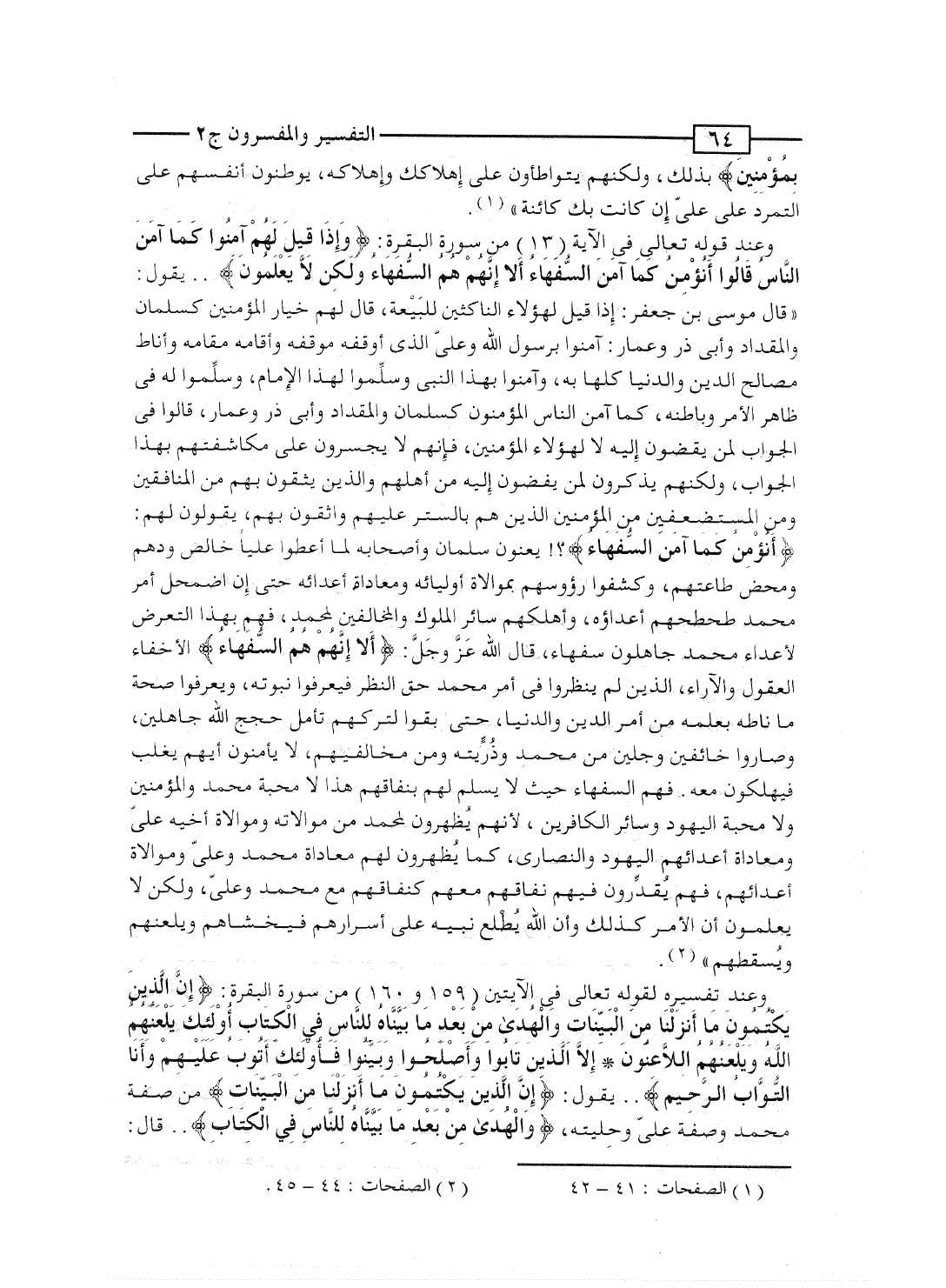 وعند قوله تعالى فى الآية [13] من سورة البقرة: {وَإِذَا قِيلَ لَهُمْ آمِنُواْ كَمَآ آمَنَ الناس قالوا أَنُؤْمِنُ كَمَآ آمَنَ السفهآء ألا إِنَّهُمْ هُمُ السفهآء ولاكن لاَّ يَعْلَمُونَ} .. يقول: "قال موسى بن جعفر: إذا قيل لهؤلاء الناكثين للبَيْعة، قال لهم خيار المؤمنين كسلمان والمقداد وأبى ذر وعمار: آمنوا برسول الله وعلىّ الذى أوقفه موقفه وأقامه مقامه وأناط مصالح الدين والدنيا كلها به، وآمنوا بهذا النبى وسلِّموا لهذا الإمام، وسلِّموا له فى ظاهر الأمر وباطنه، كما آمن الناس المؤمنون كسلمان والمقداد وأبى ذر وعمار، قالوا فى الجواب لمن يفضون إليه لا لهؤلاء المؤمنين، فإنهم لا يجسرون على مكاشفتهم بهذا الجواب، ولكنهم يذكرون لمن يفضون إليه من أهلهم والذين يثقون بهم من المنافقين ومن المستضعفين من المؤمنين الذين هم بالستر عليهم واثقون بهم، يقولون لهم: {أَنُؤْمِنُ كَمَآ آمَنَ السفهآء} ؟! يعنون سلمان وأصحابه لما أعطوا علياً خالص ودهم ومحض طاعتهم، وكشفوا رؤوسهم بموالاة أوليائه ومعاداة أعدائه حتى إن اضمحل أمر محمد طحطحهم أعداؤه، وأهلكهم سائر الملوك والمخالفين لمحمد، فهم بهذا التعرض لأعداء محمد جاهلون سفهاء، قال الله عَزَّ وجَلَّ: {ألا إِنَّهُمْ هُمُ السفهآء} الأخفاء العقول والآراء، الذين لم ينظروا فى أمر محمد حق النظر فيعرفوا نبوته، ويعرفوا صحة ما ناطه بعلمه من أمر الدين والدنيا، حتى بقوا لتركهم تأمل حجج الله جاهلين، وصاروا خائفين وجلين من محمد وذُرِّيته ومن مخالفيهم، لا يأمنون أيهم يغلب فيهلكون معه. فهم السفهاء حيث لا يسلم لهم بنفاقهم هذا لا محبة محمد والمؤمنين ولا محبة اليهود وسائر الكافرين، لأنهم يُظهرون لمحمد من موالاته وموالاة أخيه علىّ ومعاداة أعدائهم اليهود والنصارى، كما يُظهرون لهم معاداة محمد وعلىّ وموالاة أعدائهم، فهم يُقدِّرون فيهم نفاقهم معهم كنفاقهم مع محمد وعلىّ، ولكن لا يعلمون أن الأمر كذلك وأن الله يُطْلِع نبيه على أسرارهم فيخشاهم ويعلنهم ويُسقطهم".