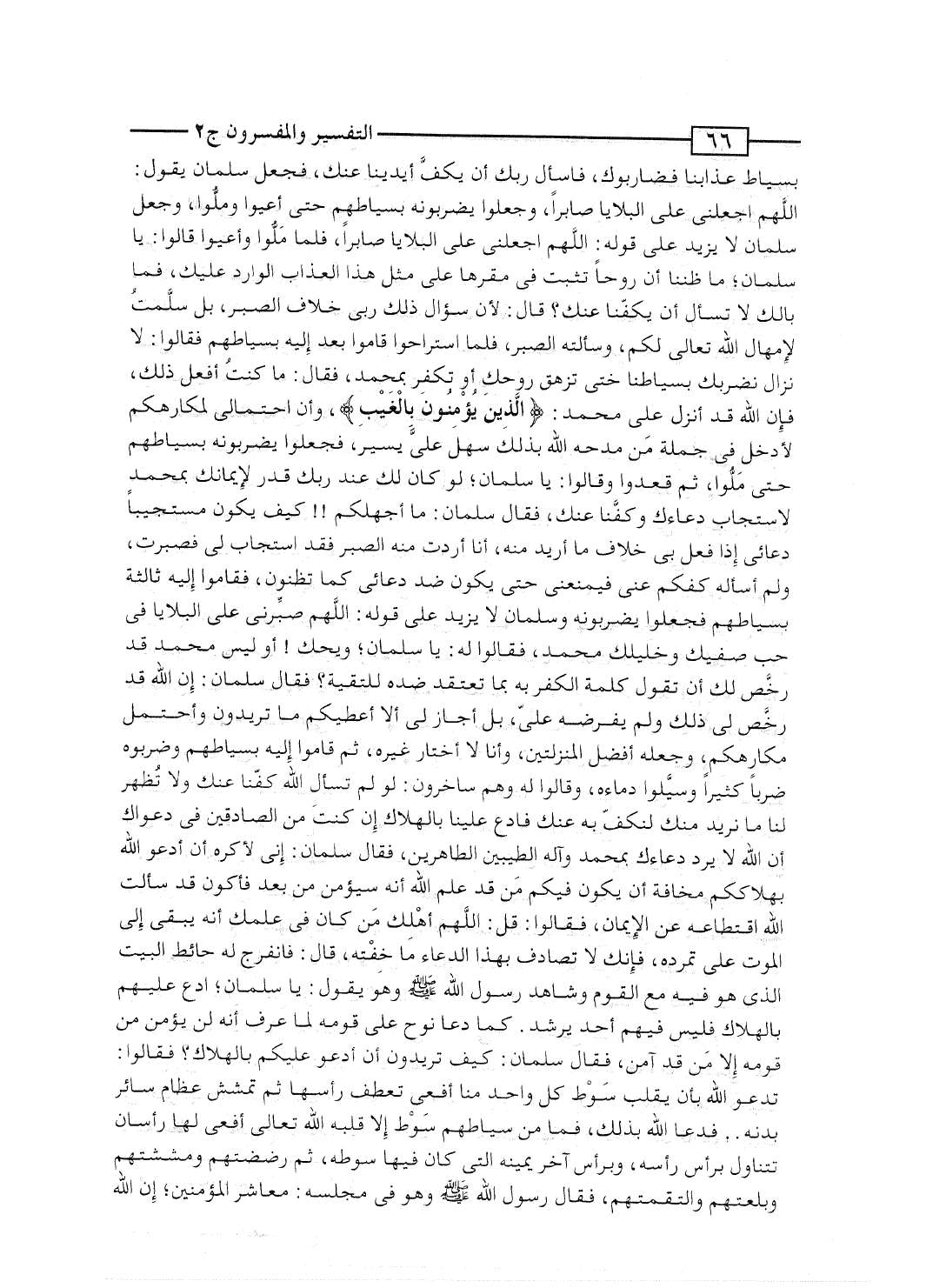 سلمان لا يزيد على قوله: اللَّهْم اجعلنى على البلايا صابراً، فلما مَلُّوا وأعيوا قالوا: يا سلمان؛ ما ظننا أن روحاً تثبت فى مقرها على مثل هذا العذاب الوارد عليك، فما بالك لا تسأل ربك أن يكفّنا عنك؟ قال: لأن سؤال ذلك ربى خلاف الصبر، بل سلَّمتُ لإمهال الله تعالى لكم، وسألته الصبر، فلما استراحوا قاموا بعد إليه بسياطهم فقالوا: لا نزال نضربك بسياطنا حتى تزهق روحك أو تكفر بمحمد، فقال: ما كنتُ أفعل ذلك، فإن الله قد أنزل على محمد: {الذين يُؤْمِنُونَ بالغيب} ، وإن احتمالى لمكارهكم لأدخل فى جملة مَن مدحه الله بذلك سهل علىَّ يسير، فجعلوا يضربونه بسياطهم حتى مَلُّوا، ثم قعدوا وقالوا: يا سلمان؛ لو كان لك عند ربك قدر لإيمانك بمحمد لاستجاب دعاءك وكفَّنا عنك، فقال سلمان: ما أجهلكم!! كيف يكون مستجيباً دعائى إذا فعل بى خلاف ما أريد منه، أنا أردت منه الصبر فقد استجاب لى فصبرت، ولم أسأله كفكم عنى فيمنعنى حتى يكون ضد دعائىكما تظنون، فقاموا إليه ثالثة بسياطهم فجعلوا يضربونه وسلمان لا يزيد على قوله: اللَّهم صبِّرنى على البلايا فى حب صفيك وخليلك محمد، فقالوا له: يا سليمان؛ ويحك! أو ليس محمد قد رخَّص لك أن تقول كلمة الكفر به بما تعتقد ضده للتقية؟ فقال سلمان: إن الله قد رخَّص لى ذلك ولم يفرضه علىّ، بل أجاز لى ألا أعطيكم ما تريدون وأحتمل مكارهكم، وجعله أفضل المنزلتين، وأنا لا أختار غيره، ثم قاموا إليه بسياطهم وضربوه ضرباً كثيراً وسيَّلوا دماءه، وقالوا له وهم ساخرون: لو لم تسأل الله كفّنا عنك ولا تُظهر لنا ما نريد منك لنكفّ به عنك فادع علينا بالهلاك إن كنتَ من الصادقين فى دعواك أن الله لا يرد دعاءك بمحمد وآله الطيبين الطاهرين، فقال سلمان: إنى لأكره أن أدعوا الله بهلاككم مخافة أن يكون فيكم مَن قد علم الله أن سيؤمن من بعد فأكون قد سألت الله اقتطاعه عن الإيمان، فقالوا: قل: اللَّهم أهْلِك مَن كان فى علمك أنه يبقى إلى الموت على تمرده، فإنك لا تصادف بهذا الدعاء ما خِفْته، قال: فانفرج له حائط البيت الذى هو فيه مع القوم وشاهد رسول الله صلى الله عليه وسلم وهو يقول: يا سلمان؛ ادع عليهم بالهلاك فليس فيهم أحد