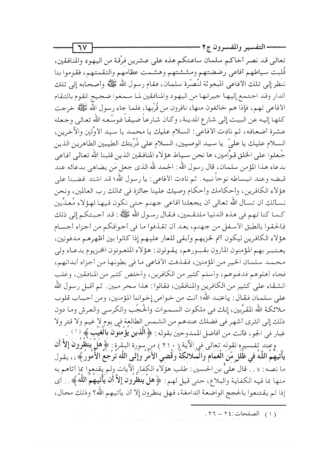 وعند تفسيره لقوله تعالى فى الآية [210] من سورة البقرة: {هَلْ يَنظُرُونَ إِلاَّ أَن يَأْتِيَهُمُ الله فِي ظُلَلٍ مِّنَ الغمام والملائكة وَقُضِيَ الأمر وَإِلَى الله تُرْجَعُ الأمور} .. يقول ما نصه: ".. قالَ علىُّ بن الحسين: طلب هؤلاء الكفار الآيات ولم يقنعوا بما أتاهم به منها بما فيه الكفاية والبلاغ، حتى قيل لهم: {هَلْ يَنظُرُونَ إِلاَّ أَن يَأْتِيَهُمُ الله} .. أى إذا لم يقتنعوا بالحجج الواضعة الدامغة، فهل ينظرون إلا أن يأتيهم الله؟ وذلك محال،