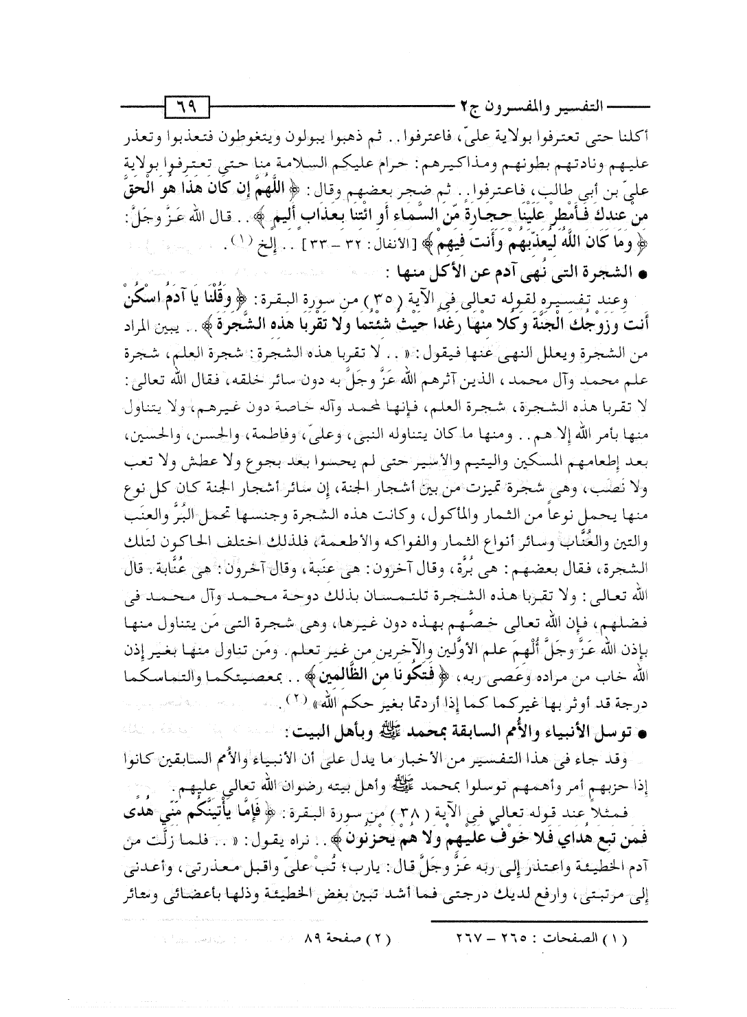 وعند تفسيره لقوله تعالى فى الآية [35] من سورة البقرة: {وَقُلْنَا يَآءَادَمُ اسكن أَنْتَ وَزَوْجُكَ الجنة وَكُلاَ مِنْهَا رَغَداً حَيْثُ شِئْتُمَا وَلاَ تَقْرَبَا هاذه الشجرة} .. يبين المراد من الشجرة ويعلل النهى عنها فيقول: ".. لا تقربا هذه الشجرة: شجرة العلم، شجرة علم محمد وآل محمد، الذين آثرهم الله عَزَّ وجَلَّ به دون سائر خلقه، فقال الله تعالى: لا تقربا هذه الشجرة، شجرة العلم، فإنها لمحمد وآله خاصة دون غيرهم، ولا يتناول منها بأمر الله إلا هم.. ومنها ما كان يتناوله النبى، وعلىّ، وفاطمة، والحسن، والحسين، بعد إطعامهم المسكين واليتيم والأسير حتى لم يحسوا بعد بجوع ولا عطش ولا تعب ولا نَصَب، وهى شجرة تميزت من بين أشجار الجنة، إن سائر أشجار الجنة كان كل نوع منها يحمل نوعاً من الثمار والمأكول، وكانت هذه الشجرة وجنسها تحمل البُرَّ والعِنَب والتين والعُنَّاب وسائر أنواع الثمار والفواكه والأطعمة، فلذلك اختلف الحاكون لتلك الشجرة، فقال بعضهم: هى بُرَّة، وقال آخرون: هى عِنَبة، وقال آخرون: هى عُنَّابة. قال الله تعالى: ولا تقربا هذه الشجرة تلتمسان بذلك دوحة محمد وآل محمد فى فضلهم، فإن الله تعالى خصَّهم بهذه دون غيرها، وهى شجرة التى مَن يتناول منها بإذن الله عَزَّ وجَلَّ أُلْهِم علم الأوَّلين والآخرين من غير تعلم. ومَنِ تناول منها بغير إذن الله خاب من مراده وعصى ربه، {فَتَكُونَا مِنَ الظالمين} .. بمعصيتكما والتماسكما درجة قد أوثر بها غيركما كما إذ أردتما بغير حكم الله".