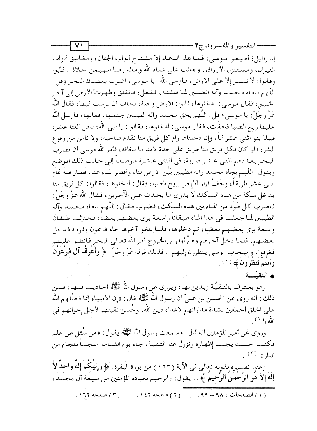 حدة لأمنا ما نخافه، فأمر الله موسى أن يضرب البحر بعددهم اثنى عشر ضربة، فى اثنتى عشرة موضعاً إلى جانب ذلك الموضع ويقول: اللَّهم بجاه محمد وآله الطيبين بَيِّن الأرض لنا، وأقصر الماء عنا، فصار فيه تمام اثنى عشر طريقاً، وجَفَّ قرار الأرض بريح الصبا، فقال: ادخلوها، فقالوا: كل فريق منا يدخل سكة من هذه السكك لا يدرى ما يحدث على الآخرين، فقال الله عَزَّ وجَلَّ: فاضرب كل طَوْد من الماء بين هذه السكك، فضرب فقال: اللَّهم بجاه محمد وآله الطيبين لما جعلت فى هذا الماء طيقاناً واسعة يرى بعضهم بعضاً، فحدثت طيقان واسعة يرى بعضهم بعضاً، ثم دخلوها، فلما بلغوا آخرها جاء فرعون وقومه فدخل بعضهم، فلما دخل آخرهم وهمَّ أولهم بالخروج أمر الله تعالى البحر فانطبق عليهم فغرقوا، وأصحاب موسى ينظرون إليهم فذلك قوله عَزَّ وجَلَّ: {وَأَغْرَقْنَا آلَ فِرْعَوْنَ وَأَنْتُمْ تَنظُرُونَ} .