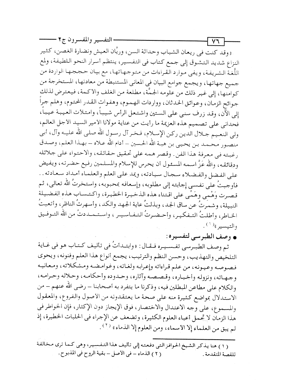 "وقد كنت فى ريعان الشباب وحداثة السن، وريَّان العيش ونضارة الغصن، كثير النزاع شديد التشوق إلى جمع كتاب فى التفسير، ينتظم أسرار النحو اللطيفة، ولمع اللُّغة الشريفة، ويفى موارد القراءات من متوجهاتها، مع بيان حججها الواردة من جميع جهاتها، ويجمع جوامع البيان فى المعانى المستنبطة من معادنها، المستخرجة من كوامنها، إلى غير ذلك من علومه الجمَّة، مطلعة من الغلف والأكمة، فيعترض لذلك جوائح الزمان، وعوائق الحدثان، وواردات الهموم، وهفوات القدر المحتوم، وهلم جرآ إلى الآن، وقد زرف سنى على الستين واشتعل الرأس شيباً، وامتلأت العيبة عيباً، فحدانى على تصميم هذه العزيمة ما رأيت من عناية مولانا الأمير السيد الأجل العالِم، ولى النعِيم جلال الدين ركن الإسلام، فخر آل رسول الله صلى الله عليه وآله، أبَى منصور محمد بن يحيى بن هبة الله الحسين - أدام الله علاه - بهذا العلم، وصدق رغبته فى معرفة هذا الفن. وقصر همه على تحقيق حقائقه، والاحتواء على جلائله ودقائقه، والله عَزَّ اسمه المسئول أن يحرس للإسلام والمسلمين رفيع حضرته، ويفيض على الفضل والفضلاء سجال سيادته، ويمد على العلم والعلماء أمداد سعادته.. فأوجبتُ على نفسى إجابته إلى مطلوبه، وإسعافه بمحبوبه، واستخرتُ الله تعالى، ثم قصرت وهَمْى وهَمِّى على اقتناء هذه الذخيرة الخطيرة، واكتساب هذه الفضيلة النبيلة، وشمرتُ عن ساق الجد، وبذلتُ غاية الجهد والكد، وأسهرتُ الناظر، وأتعبتُ الخاطر، وأطلتُ التفكير، وأحضرتُ التفاسير، واستمددتُ من الله التوفيق والتيسير".