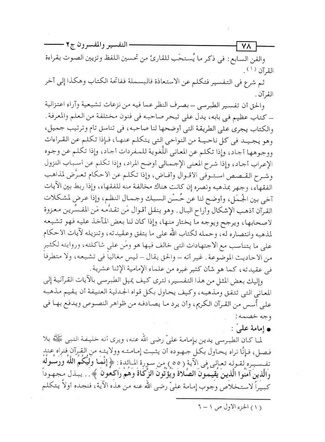 وإليك بعض المثل من هذا التفسير، لترى كيف يميل الطبرسى بالآيات القرآنية إلى المعانى التى تتفق ومذهبه، وكيف يحاول بكل قواه الجدلية العنيفة أن يقيم مذهبه على أُسس من القرآن الكريم، وأن يرد ما يصادفه من ظواهر النصوص ويدفع بها فى وجه خصمه: