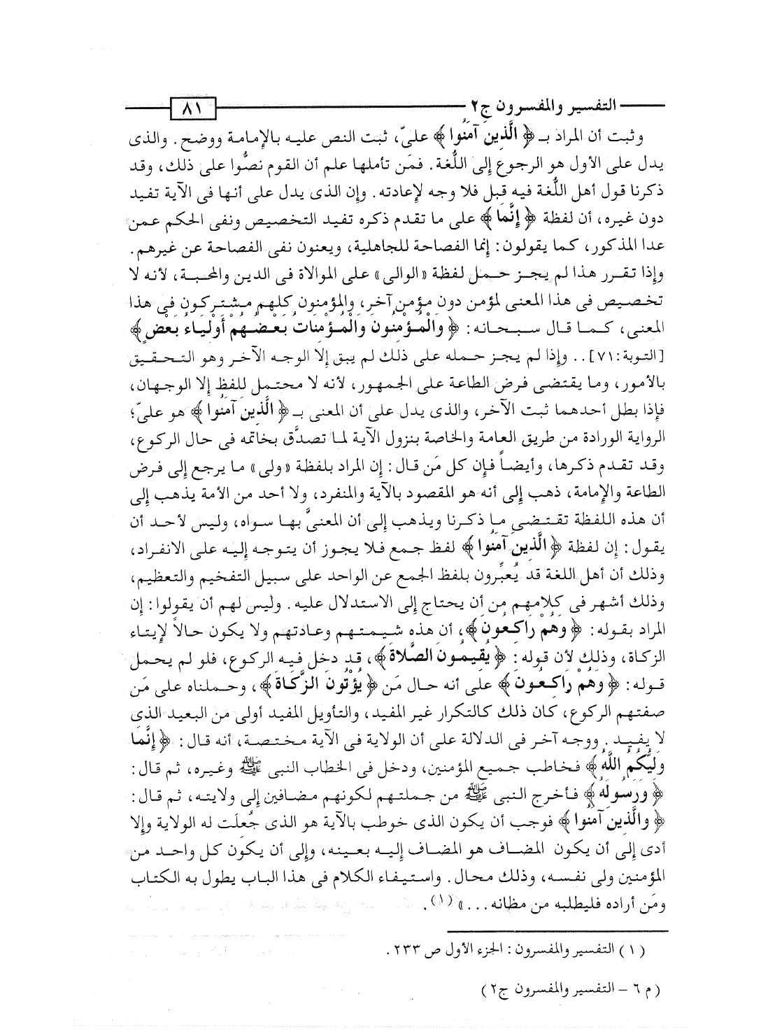 وثبت أن المراد بـ {الذين آمَنُواْ} علىّ، ثبت النص عليه بالإمامة ووضح. والذى يدل على الأول هو الرجوع إلى اللُّغة. فمن تأملها علم أن القوم نَصُّوا على ذلك، وقد ذكرنا قول أهل اللُّغة فيه قبل فلا وجه لإعادته. وإن الذى يدل على أنها فى الآية تفيد ذلك دون غيره، أن لفظة {إِنَّمَا} على ما تقدم ذكره تفيد التخصيص ونفى الحكم عمن عدا المذكور، كما يقولون: إنما الفصاحة للجاهلية، ويعنون نفى الفصاحة عن غيرهم. وإذا تقرر هذا لم يجز حمل لفظة "الوالى" على الموالاة فى الدين والمحبة، لأنه لا تخصيص فى هذا المعنى لمؤمن دون مؤمن آخر، والمؤمنون كلهم مشتركون فى هذا المعنى، كما قال سبحانه: {والمؤمنون والمؤمنات بَعْضُهُمْ أَوْلِيَآءُ بَعْضٍ} [التوبة: 71] .. وإذا لم يجز حمله على ذلك لم يبقَ إلا الوجه الآخر وهو التحقيق بالأمور، وما يقتضى فرض الطاعة على الجمهور، لأنه لا محتمل للفظ إلا الوجهان، فإذا بطل أحدهما ثبت الآخر، والذى يدل على أن المعنى بـ {الذين آمَنُواْ} هو علىّ؛ الرواية الواردة من طريق العامة والخاصة بنزول الآية فيه لما تصدَّق بخاتمه فى حال الركوع، وقد تقدم ذكرها، وأيضاً فإن كل مَن قال: إن المراد بلفظة "ولى" ما يرجع إلى فرض الطاعة والإمامة، ذهب إلى أنه هو المقصود بالآية والمنفرد، ولا أحد من الأمة يذهب إلى أن هذه اللفظة تقتضى ما ذكرنا ويذهب إلى أن المعنىَّ بها سواه، وليس لأحد أن يقول: إن لفظة {الذين آمَنُواْ} لفظ جمع فلا يجوز أن يتوجه إليه