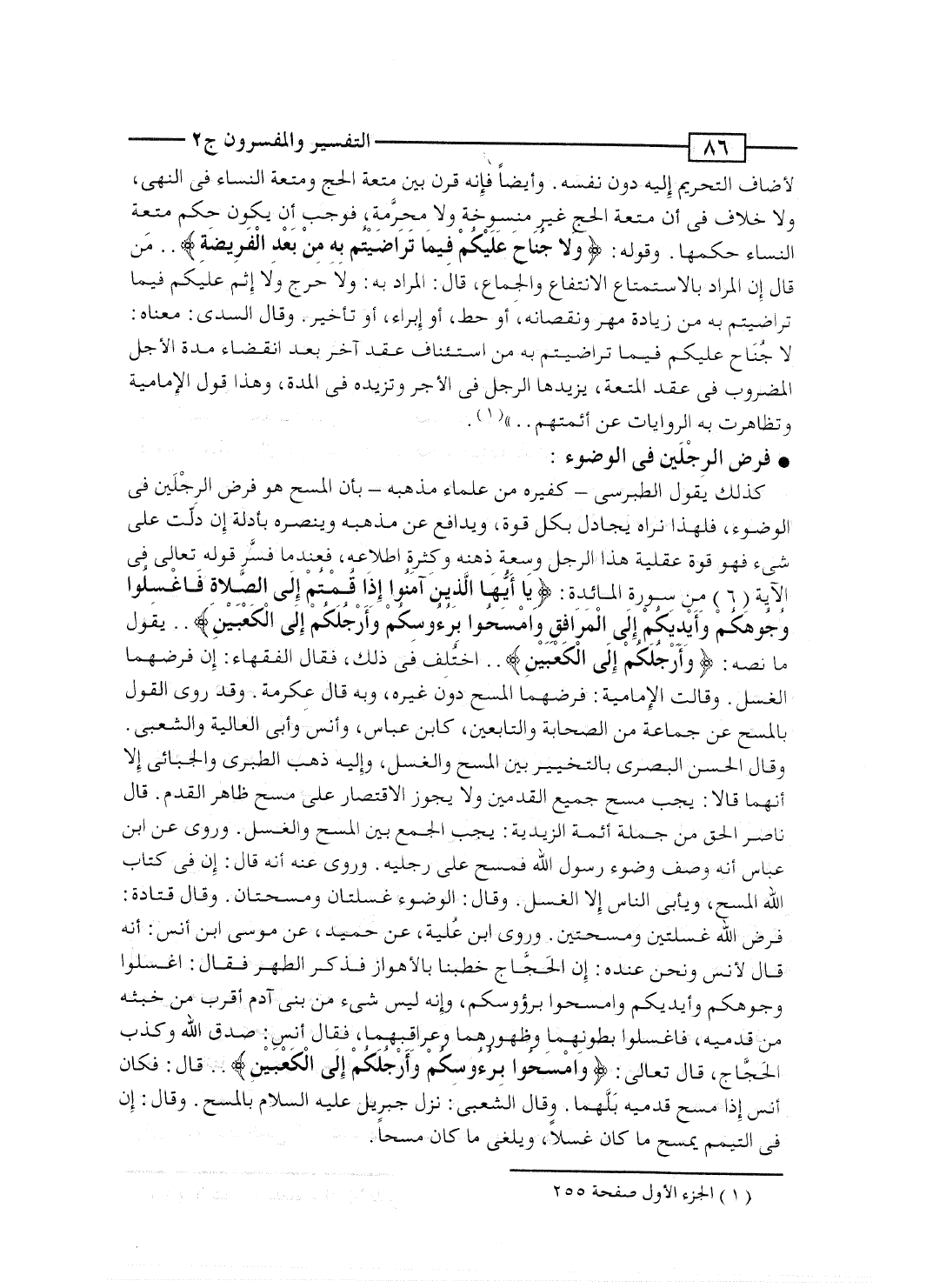 كذلك يقول الطبرسى - كغيره من علماء مذهبه - بأن المسح هو فرض الرِجْلين فى الوضوء، فلهذا نراه يجادل بكل قوة، ويدافع عن مذهبه وينصره بأدلة إن دلَّت على شئ فهو قوة عقلية هذا الرجل وسعة ذهنه وكثرة اطلاعه، فعندما فسَّر قوله تعالى فى الآية [6] من سورة المائدة: {يَا أَيُّهَا الذين آمَنُواْ إِذَا قُمْتُمْ إِلَى الصلاة فاغسلوا وُجُوهَكُمْ وَأَيْدِيَكُمْ إِلَى المرافق وامسحوا بِرُؤُوسِكُمْ وَأَرْجُلَكُمْ إِلَى الكعبين} .. يقول ما نصه: {وَأَرْجُلَكُمْ إِلَى الكعبين} .. اختُلِفَ فى ذلك، فقال جمهور الفقهاء: إن فرضهما الغسل. وقالت الإمامية: فرضهما المسح دون غيره، وبه قال عِكرمة. وقد روى القول بالمسح عن جماعة من الصحابة والتابعين، كابن عباس، وأنس وأبى العالية والشعبى. وقال الحسن البصرى بالتخيير بين المسح والغسل، وإليه ذهب الطبرى والجبائى إلا أنهم قالا: يجب مسح جميع القدمين ولا يجوز الاقتصار على مسح ظاهر القدم. قال ناصر الحق من جملة أئمة الزيدية: يجب الجمع بين المسح والغسل. وروى عن ابن عباس أنه وصف وضوء رسول الله فمسح على رجليه. وروى عنه أنه قال: إن فى كتاب الله المسح، ويأبى الناس إلا الغسل. وقال: الوضوء غسلتان ومسحتان. وقال قتادة: فرض الله غسلتين ومسحتين. وروى ابن عُلية، عن حميد، عن موسى ابن أنس: أنه قال لأنس ونحن عنده: إن الحَجَّاج خطبنا بالأهواز فذكر الطهر فقال: اغسلوا وجوهكم وأيديكم وامسحوا برؤوسكم، وإنه ليس شئ من بنى آدم أقرب من خبثه من قدميه، فاغسلوا بطونهما وظهورهما وعراقبهما، فقال أنس: صدق الله وكذب الحَجَّاج، قال تعالى: {وامسحوا بِرُؤُوسِكُمْ وَأَرْجُلَكُمْ إِلَى الكعبين} .. قال فكان أنس إذا مسح قدميه بَلَّهما. وقال الشعبى: نزل جبريل عليه السلام بالمسح. وقال: إن فى التيمم يمسح ما كان غسلاً، ويلغى ما كان مسحاً.
