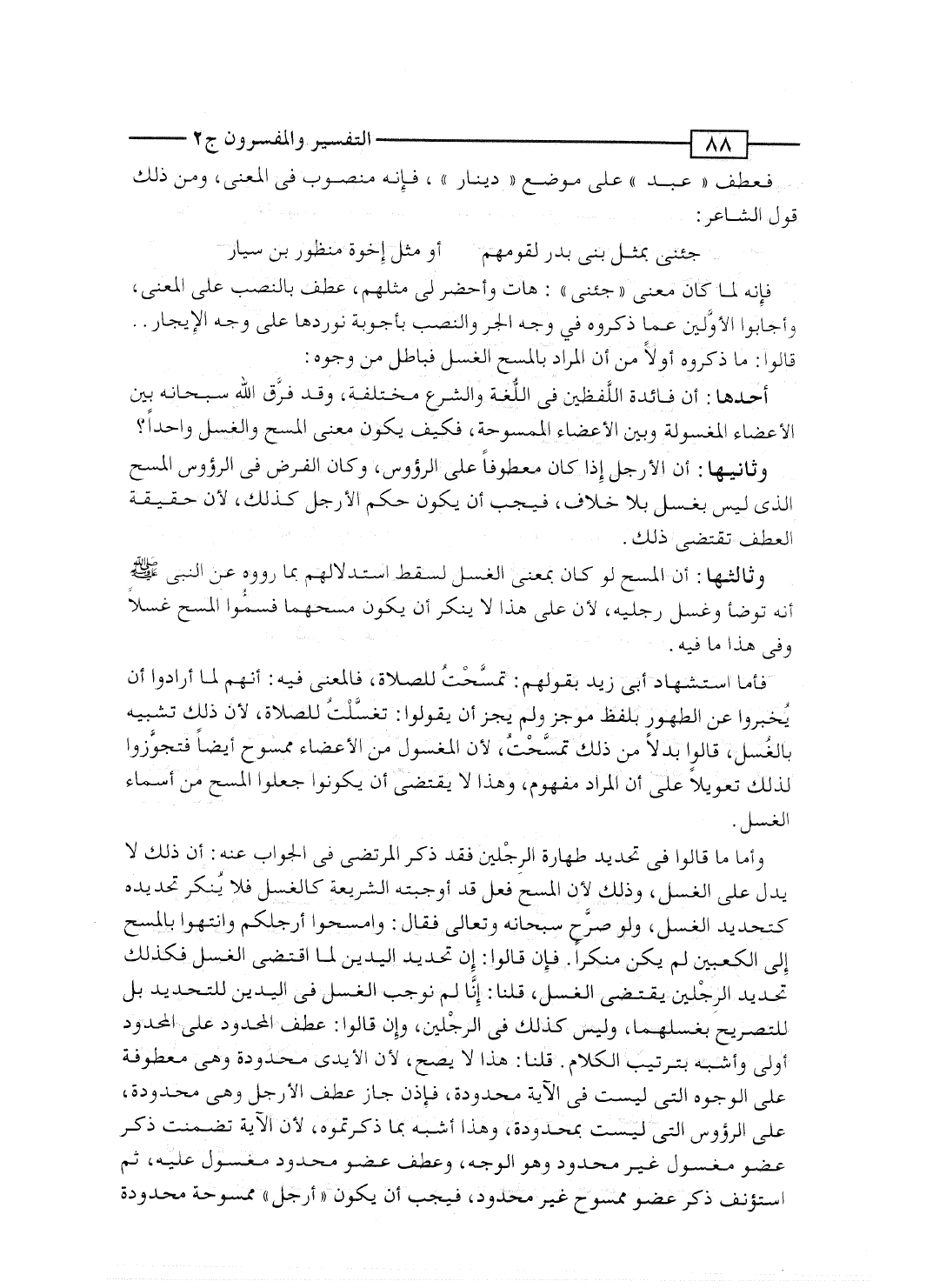 وثانيها: أن الأرجل إذا كان معطوفاً على الرؤوس، وكان الفرض فى الرؤوس المسح الذى ليس بغسل بلا خلاف، فيجب أن يكون حكم الأرجل كذلك، لأن حقيقة العطف تقتضى ذلك.