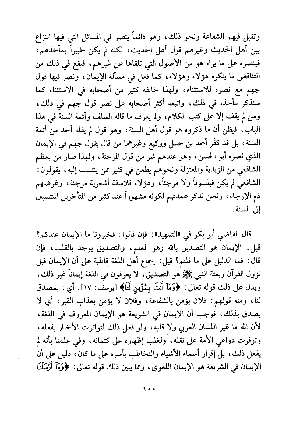 قال القاضي أبو بكر في [التمهيد] : فإن قالوا: فخبرونا ما الإيمان عندكم؟ قيل: الإيمان هو التصديق بالله وهو العلم , والتصديق يوجد بالقلب فإن قال: فما الدليل على ما قلتم؟ قيل: إجماع أهل اللغة قاطبة على أن الإيمان قبل نزول القرآن وبعثة النبي صلى الله عليه وسلم هو التصديق لا يعرفون في اللغة إيمانا غير ذلك ويدل على ذلك قوله تعالى: {وَمَا أَنتَ بِمُؤْمِنٍ لِّنَا} [يوسف: 17] أي بمصدق لنا. ومنه قولهم: فلان يؤمن بالشفاعة وفلان لا يؤمن بعذاب القبر أي: لا يصدق بذلك. فوجب أن الإيمان في الشريعة هو الإيمان المعروف في اللغة ; لأن الله ما غير اللسان العربي ولا قلبه ولو فعل ذلك لتواترت الأخبار بفعله وتوفرت دواعي الأمة على نقله ولغلب إظهاره على كتمانه , وفي علمنا بأنه لم يفعل ذلك بل إقرار أسماء الأشياء والتخاطب بأسره على ما كان دليل على أن الإيمان في الشريعة هو الإيمان اللغوي ومما يبين ذلك قوله تعالى: {وَمَا أَرْسَلْنَا