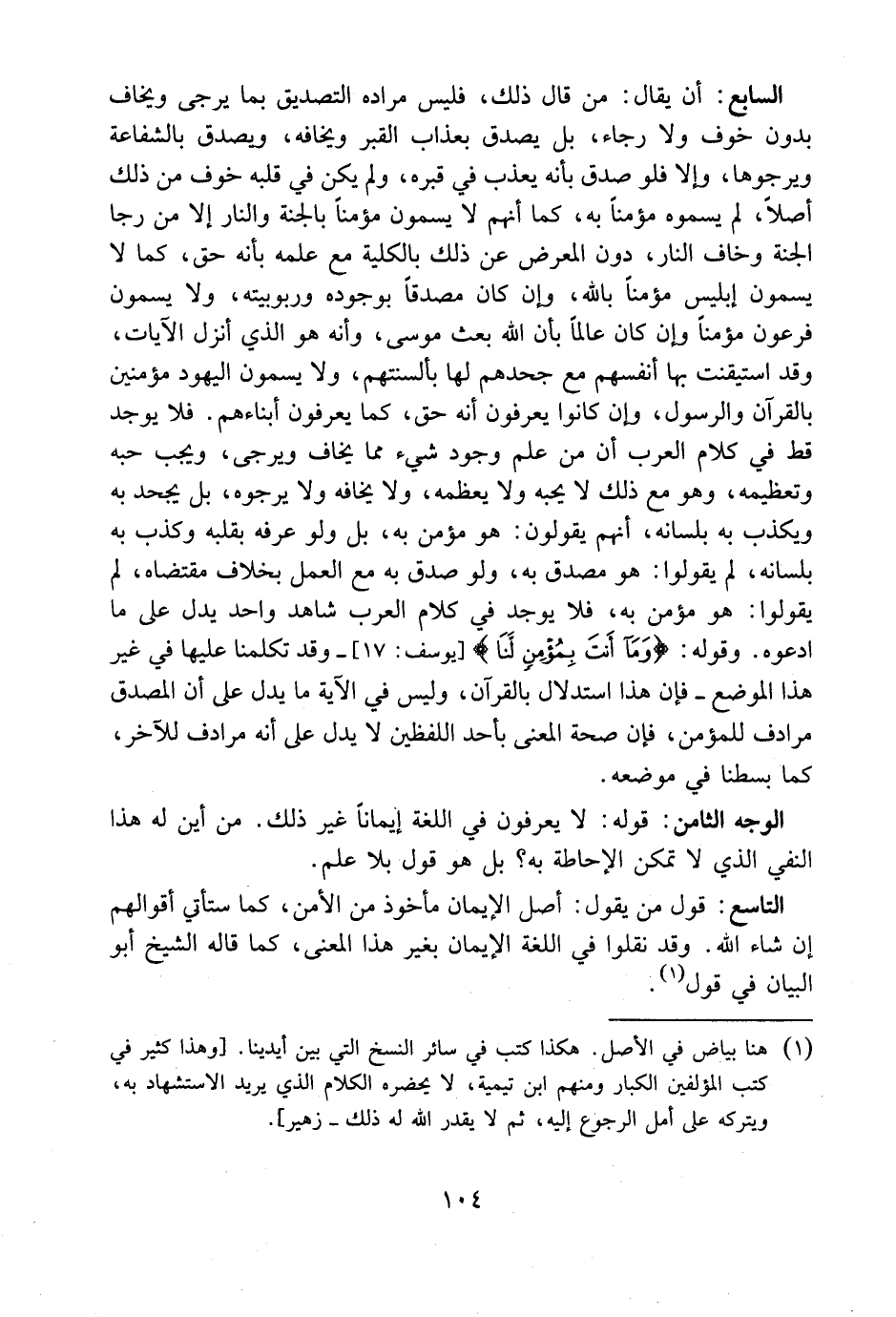 السابع: أن يقال: من قال ذلك، فليس مراده التصديق بما يرجى ويخاف بدون خوف ولا رجاء، بل يصدق بعذاب القبر ويخافه، ويصدق بالشفاعة ويرجوها. وإلا فلو صدق بأنه يعذب في قبره، ولم يكن في قلبه خوف من ذلك أصلًا. لم يسموه مؤمنًا به، كما أنهم لا يسمون مؤمنًا بالجنة والنار إلا من رجا الجنة وخاف النار، دون المعرض عن ذلك بالكلية مع علمه بأنه حق. كما لا يسمون إبليس مؤمنا بالله، وإن كان مصدقًا بوجوده وربوبيته، ولا يسمون فرعون مؤمنًا، وإن كان عالمًا بأن الله بعث موسى، وأنه هو الذي أنزل الآيات، وقد استيقنت بها أنفسهم مع جحدهم لها بألسنتهم. ولا يسمون اليهود مؤمنين بالقرآن والرسول، وإن كانوا يعرفون أنه حق، كما يعرفون أبناءهم. فلا يوجد قط في كلام العرب أن من علم وجود شيء مما يخاف ويرجى، ويجب حبه وتعظيمه، وهو مع ذلك لا يحبه ولا يعظمه، ولا يخافه ولا يرجوه، بل يجحد به ويكذب به بلسانه، أنهم يقولون: هو مؤمن، بل ولو عرفه بقلبه وكذب به بلسانه، لم يقولوا: هو مصدق به. ولو صدق به مع العمل بخلاف مقتضاه، لم يقولوا: هو مؤمن به. فلا يوجد في كلام العرب شاهد واحد يدل على ما ادعوه.