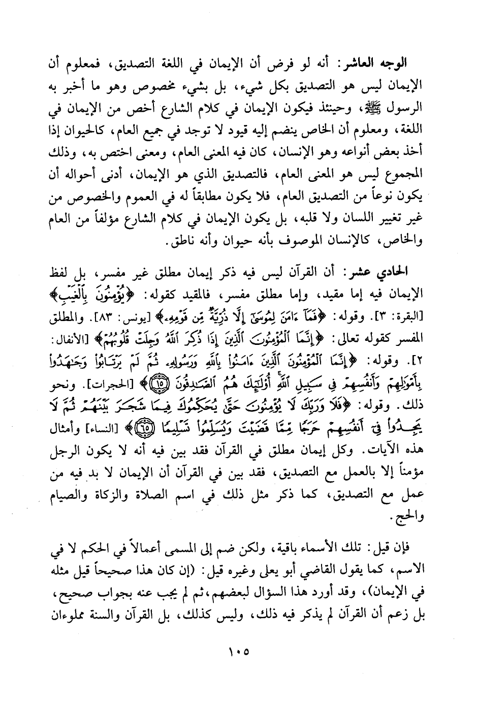 الوجه العاشر: أنه لو فرض أن الإيمان في اللغة التصديق، فمعلوم أن الإيمان ليس هو التصديق بكل شيء، بل بشيء مخصوص، وهو ما أخبر به الرسول، صلى الله عليه وسلم، وحينئذ فيكون الإيمان في كلام الشارع أخص من الإيمان في اللغة، ومعلوم أن الخاص ينضم إليه قيود لا توجد في جميع العام كالحيوان إذا أخذ بعض أنواعه وهو الإنسان كان فيه المعنى العام ومعنى اختص به، وذلك المجموع ليس هو المعنى العام. فالتصديق الذي هو الإيمان، أدنى أحواله أن يكون نوعًا من التصديق العام، فلا يكون مطابقًا له في العموم والخصوص من غير تغيير اللسان ولا قلبه، بل يكون الإيمان في كلام الشارع مؤلفًا من العام والخاص كالإنسان الموصوف بأنه حيوان وأنه ناطق.