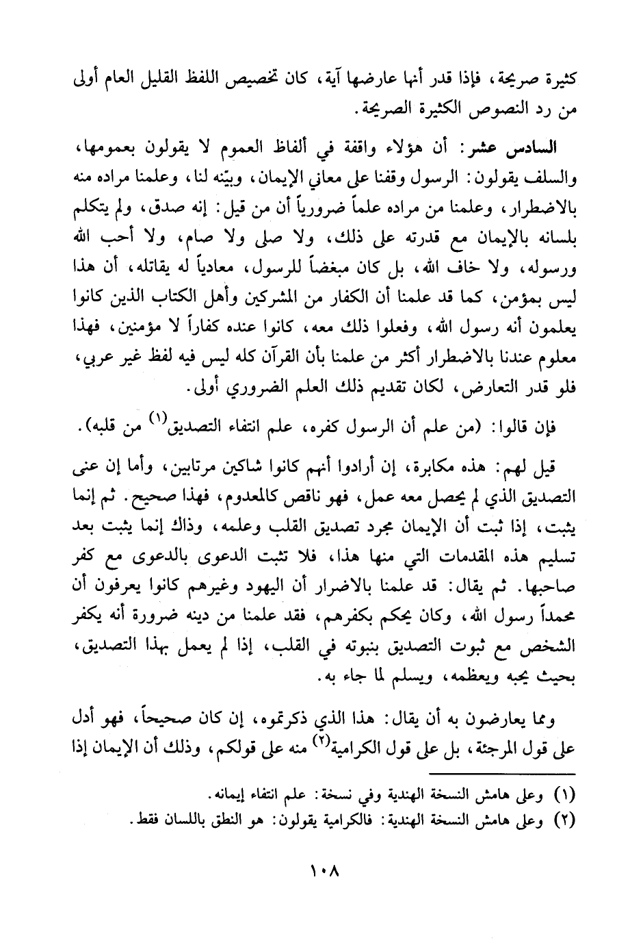 السادس عشر: أن هؤلاء واقفة في ألفاظ العموم لا يقولون بعمومها والسلف يقولون: الرسول وقفنا على معاني الإيمان وبينه لنا. وعلمنا مراده منه بالاضطرار، وعلمنا من مراده علمًا ضروريًا أن من قيل: إنه صدق. ولم يتكلم بلسانه بالإيمان مع قدرته على ذلك، ولا صلى ولا صام، ولا أحب الله ورسوله ولا خاف الله، بل كان مبغضًا للرسول، معاديًا له يقاتله، أن هذا ليس بمؤمن. كما قد علمنا أن الكفار من المشركين وأهل الكتاب الذين كانوا يعلمون أنه رسول الله وفعلوا ذلك معه، كانوا عنده كفارًا لا مؤمنين، فهذا معلوم عندنا بالاضطرار أكثر من علمنا بأن القرآن كله ليس فيه لفظ غير عربي. فلو قدر التعارض، لكان تقديم ذلك العلم الضروري أولى.