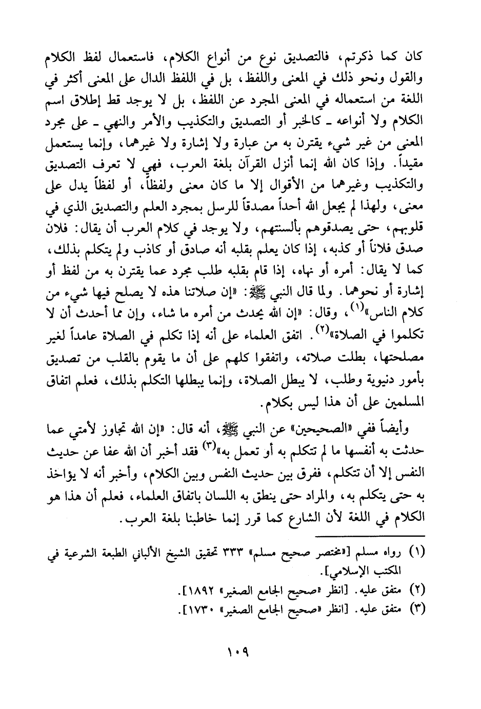 وإذا كان الله إنما أنزل القرآن بلغة العرب، فهي لا تعرف التصديق والتكذيب وغيرهما من الأقوال إلا ما كان معنى ولفظًا، أو لفظًا يدل على معنى؛ ولهذا لم يجعل الله أحدًا مصدقًا للرسل بمجرد العلم والتصديق الذي في قلوبهم حتى يصدقوهم بألسنتهم، ولا يوجد في كلام العرب أن يقال: فلان صدق فلانًا أو كذبه، إذا كان يعلم بقلبه أنه صادق أو كاذب ولم يتكلم بذلك، كما لا يقال: أمره أو نهاه، إذا قام بقلبه طلب مجرد عما يقترن به من لفظ أو إشارة أو نحوهما. ولما قال النبي صلى الله عليه وسلم: " إن صلاتنا هذه لا يصلح فيها شيء من كلام الناس ". وقال: " إن الله يحدث من أمره ما شاء، وإن مما أحدث ألاّ تكلِّموا في الصلاة " اتفق العلماء على أنه إذا تكلم في الصلاة عامدًا لغير مصلحتها، بطلت صلاته. واتفقوا كلهم على أن ما يقوم بالقلب من تصديق بأمور دنيوية وطلب لا يبطل الصلاة، وإنما يبطلها التكلم بذلك، فعلم اتفاق المسلمين على أن هذا ليس بكلام.