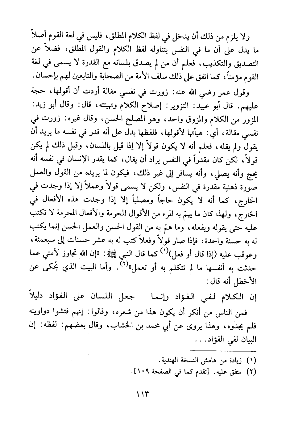 وقول عمر رضي الله عنه: زورت في نفسي مقالة أردت أن أقولها، حجة عليهم. قال أبو عبيد: التزوير إصلاح الكلام وتهيئته، قال: وقال أبو زيد: المُزَوَّر من الكلام والمزوَّق واحد، وهو المصلح الحسن، وقال غيره: زورت في نفسي مقالة، أي: هيأتها لأقولها. فلفظها يدل على أنه قدر في نفسه ما يريد أن يقوله ولم يقله، فعلم أنه لا يكون قولًا إلا إذا قيل باللسان، وقبل ذلك لم يكن قولًا، لكن كان مقدرًا في النفس يراد أن يقال، كما يقدر الإنسان في نفسه أنه يحج وأنه يصلي، وأنه يسافر، إلى غير ذلك، فيكون لما يريده من القول والعمل صورة ذهنية مقدرة في النفس، ولكن لا يسمى قولًا وعملًا إلا إذا وجد في الخارج، كما أنه لا يكون حاجًا ومصليًا إلا إذا وجدت هذه الأفعال في الخارج؛ ولهذا كان ما يهم به المرء من الأقوال المحرمة والأفعال المحرمة لا تكتب عليه حتى يقوله، ويفعله، وما هم به من القول الحسن، والعمل الحسن إنما يكتب له به حسنة واحدة، فإذا صار قولًا وفعلًا كتب له به عشر حسنات إلى سبعمائة، وعوقب عليه إذا قال أو فعل كما قال النبي صلى الله عليه وسلم: " إن الله تجاوز لأمتي عما حدّثت به أنفسها ما لم تتكلم به أو تعمل ".