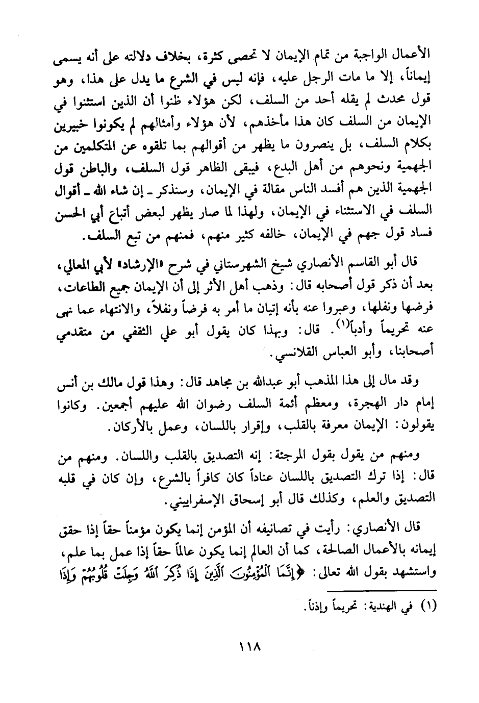 قال أبو القاسم الأنصاري شيخ الشهرستاني في [شرح الإرشاد] لأبي المعالي، بعد أن ذكر قول أصحابه قال: وذهب أهل الأثر إلى أن الإيمان جميع الطاعات، فَرْضِها ونَفْلِها، وعبروا عنه بأنه إتيان ما أمر الله به فرضًا ونفلاً، والانتهاء عما نهى عنه تحريمًا وأدبًا. قال: وبهذا كان يقول أبو علي الثقفي من متقدمي أصحابنا، وأبو العباس القلانسي.