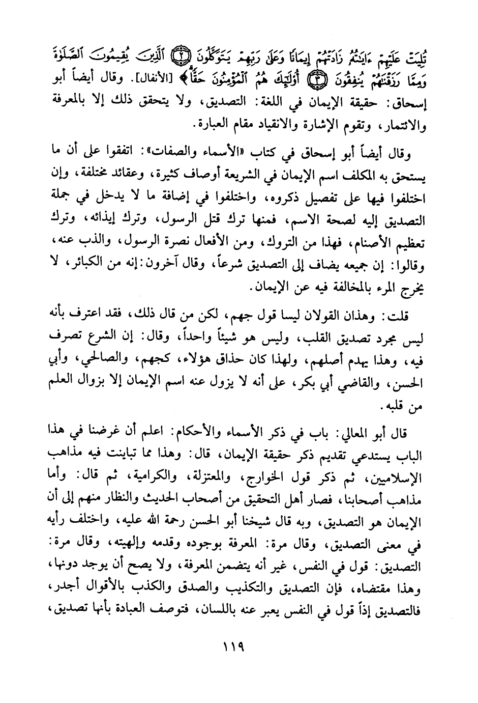 قال أبو المعالي: [باب في ذكر الأسماء والأحكام] : اعلم أن غرضنا في هذا الباب يستدعى تقديم ذكر حقيقة الإيمان. قال: وهذا مما تباينت فيه مذاهب الإسلاميين، ثم ذكر قول الخوارج، والمعتزلة، والكَرَّامية، ثم قال: وأما مذاهب أصحابنا، فصار أهل التحقيق من أصحاب الحديث والنظار منهم إلى أن الإيمان هو التصديق، وبه قال شيخنا أبو الحسن رحمة الله عليه واختلف رأيه في معنى التصديق؛ وقال مرة: المعرفة بوجوده وقدمه وإلهيته، وقال مرة: التصديق: قول في النفس، غير أنه يتضمن المعرفة، ولا يصح أن يوجد دونها، وهذا مقتضاه، فإن التصديق والتكذيب والصدق والكذب بالأقوال أجدر فالتصديق إذًا قول في النفس يعبر عنه باللسان، فتوصف العبادة بأنها تصديق؛