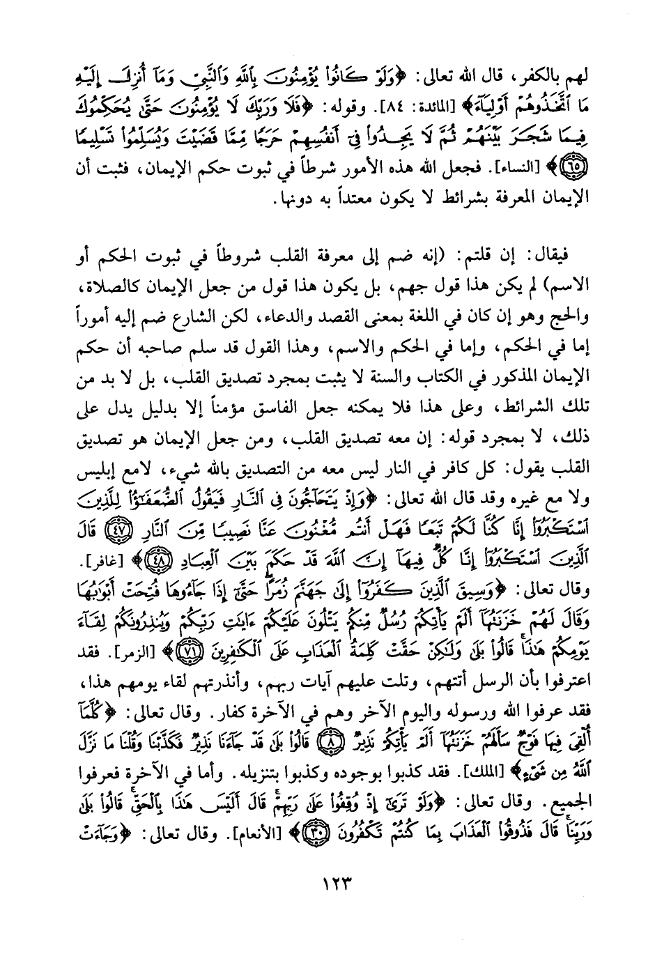 فيقال: إن قلتم: إنه ضم إلى معرفة القلب شروطاً في ثبوت الحكم أو الاسم، لم يكن هذا قول جهم، بل يكون هذا قول من جعل الإيمان كالصلاة، والحج هو وإن كان في اللغة بمعنى القصد والدعاء، لكن الشارع ضم إليه أموراً إما في الحكم وإما في الحكم والاسم، وهذا القول قد سلم صاحبه أن حكم الإيمان المذكور في الكتاب والسنة لا يثبت بمجرد تصديق القلب، بل لابد من تلك الشرائط، وعلى هذا فلا يمكنه جعل الفاسق مؤمناً إلا بدليل يدل على ذلك، لا بمجرد قوله: إن معه تصديق القلب، ومن جعل الإيمان هو تصديق القلب يقول: كل كافر في النار ليس معهم من التصديق بالله شيء، لا مع إبليس ولا مع غيره، وقد قال الله تعالى: {وَإِذْ يَتَحَاجُّونَ فِي النَّارِ فَيَقُولُ الضُّعَفَاء لِلَّذِينَ اسْتَكْبَرُوا إِنَّا كُنَّا لَكُمْ تَبَعًا فَهَلْ أَنتُم مُّغْنُونَ عَنَّا نَصِيبًا مِّنَ النَّارِ قَالَ الَّذِينَ اسْتَكْبَرُوا إِنَّا كُلٌّ فِيهَا إِنَّ اللَّهَ قَدْ حَكَمَ بَيْنَ الْعِبَادِ} [غافر: 47، 48] وقال تعالى: {وَسِيقَ الَّذِينَ كَفَرُوا إِلَى جَهَنَّمَ زُمَرًا حَتَّى إِذَا جَاؤُوهَا فُتِحَتْ أَبْوَابُهَا وَقَالَ لَهُمْ خَزَنَتُهَا أَلَمْ يَأْتِكُمْ رُسُلٌ مِّنكُمْ يَتْلُونَ عَلَيْكُمْ آيَاتِ رَبِّكُمْ وَيُنذِرُونَكُمْ لِقَاء يَوْمِكُمْ هَذَا قَالُوا بَلَى وَلَكِنْ حَقَّتْ كَلِمَةُ الْعَذَابِ عَلَى الْكَافِرِينَ} [الزمر: 71] ، فقد اعترفوا بأن الرسل أتتهم وتلت عليهم آيات ربهم وأنذرتهم لقاء يومهم هذا، فقد عرفوا الله ورسوله واليوم الآخر وهم في الآخرة كفار.