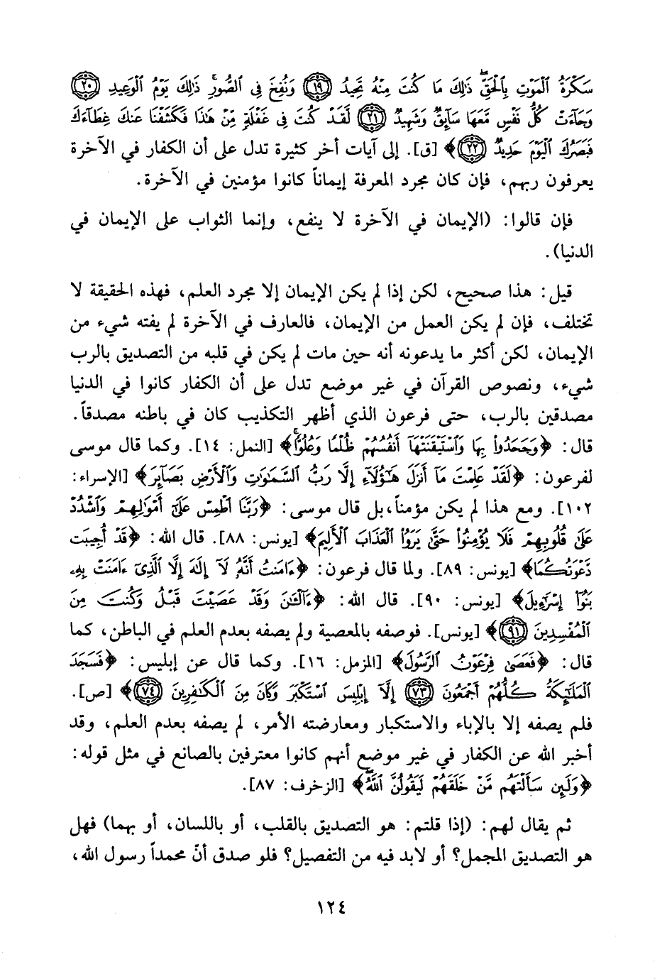 قيل: هذا صحيح، لكن إذا لم يكن الإيمان إلا مجرد العلم، فهذه الحقيقة لا تختلف، فإن لم يكن العمل من الإيمان، فالعارف في الآخرة لم يفته شيء من الإيمان، لكن أكثر ما يدعونه أنه حين مات لم يكن في قلبه من التصديق بالرب شيء، ونصوص القرآن في غير موضع تدل على أن الكفار كانوا في الدنيا مصدقين بالرب، حتى فرعون الذي أظهر التكذيب كان في باطنه مصدقاً، قال تعالي: {وَجَحَدُوا بِهَا وَاسْتَيْقَنَتْهَا أَنفُسُهُمْ ظُلْمًا وَعُلُوًّا} [النمل: 14] ، وكما قال موسى لفرعون: {قَالَ لَقَدْ عَلِمْتَ مَا أَنزَلَ هَؤُلاء إِلاَّ رَبُّ السَّمَاوَاتِ وَالأَرْضِ بَصَآئِرَ} [الإسراء: 102] ، ومع هذا لم يكن مؤمناً؛ بل قال موسى: {رَبَّنَا اطْمِسْ عَلَى أَمْوَالِهِمْ وَاشْدُدْ عَلَى قُلُوبِهِمْ فَلاَ يُؤْمِنُواْ حَتَّى يَرَوُاْ الْعَذَابَ الأَلِيمَ} [يونس: 88] قال الله: {قَدْ أُجِيبَت دَّعْوَتُكُمَا} [يونس: 89] ، ولما قال فرعون: {آمَنتُ أَنَّهُ لا إِلِهَ إِلاَّ الَّذِي آمَنَتْ بِهِ بَنُو إِسْرَائِيلَ} [يونس: 90] . قال الله: {آلآنَ وَقَدْ عَصَيْتَ قَبْلُ وَكُنتَ مِنَ الْمُفْسِدِينَ} [يونس: 91] فوصفه بالمعصية، ولم يصفه بعدم العلم في الباطن كما قال: {فَعَصَى فِرْعَوْنُ الرَّسُولَ} [المزمل: 16] ، وكما قال عن إبليس: {فَسَجَدَ الْمَلَائِكَةُ كُلُّهُمْ أَجْمَعُونَ إِلَّا إِبْلِيسَ اسْتَكْبَرَ وَكَانَ مِنْ الْكَافِرِينَ} [ص: 73، 74] ،