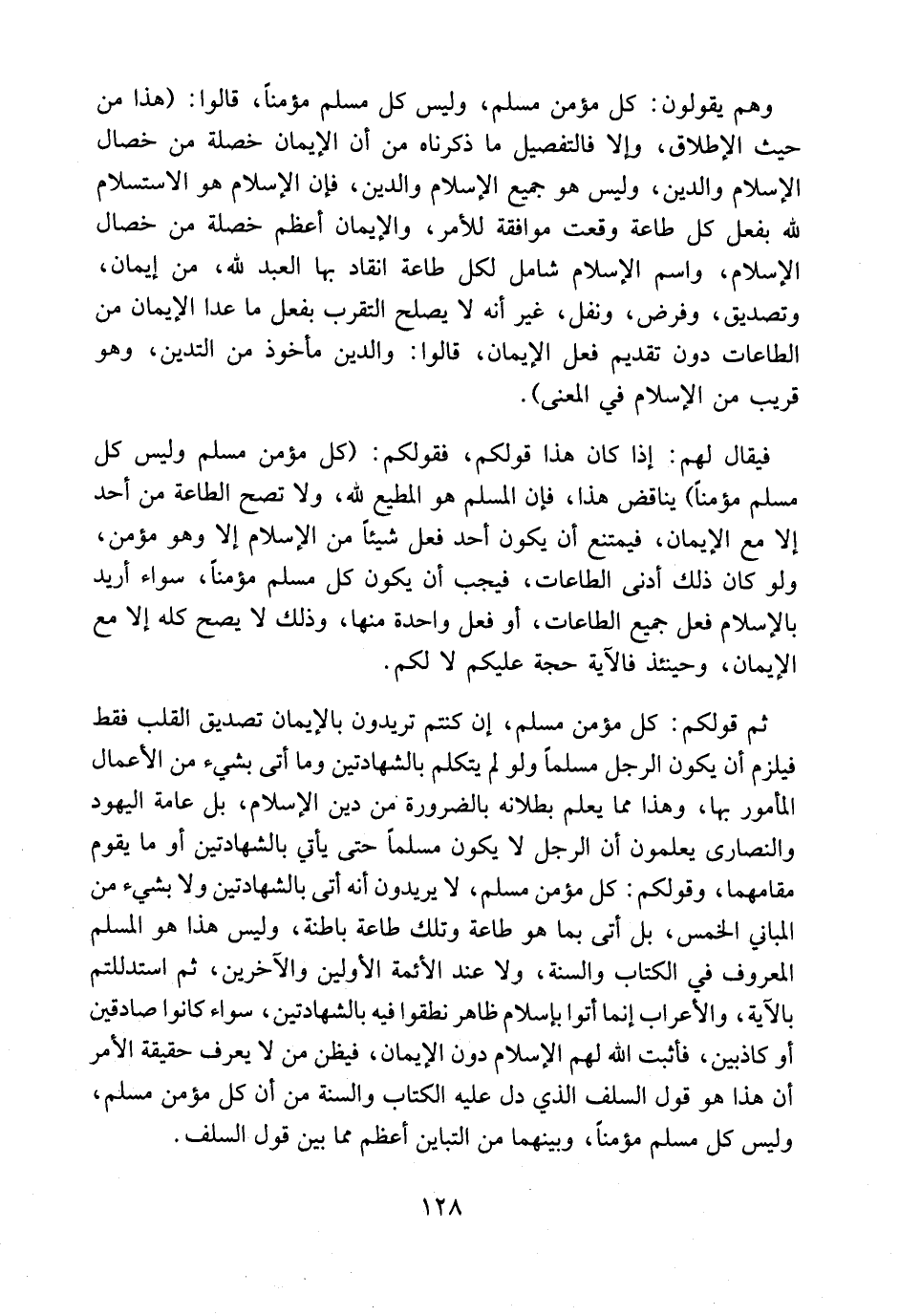 ثم قولكم: كل مؤمن مسلم، إن كنتم تريدون بالإيمان تصديق القلب فقط، فيلزم أن يكون الرجل مسلماً ولو لم يتكلم بالشهادتين ولا أتى بشيء من الأعمال المأمور بها، وهذا مما يعلم بطلانه بالضرورة من دين الإسلام، بل عامة اليهود والنصارى يعلمون أن الرجل لا يكون مسلماً حتى يأتي بالشهادتين أو ما يقوم مقامهما، وقولكم: كل مؤمن مسلم، لا يريدون أنه أتى بالشهادتين ولا بشيء من المباني الخمس، بل أتى بما هو طاعة وتلك طاعة باطنة، وليس هذا هو المسلم المعروف في الكتاب والسنة، ولا عند الأئمة الأولين والآخرين، ثم استدللتم بالآية، والأعراب إنما أتوا بإسلام ظاهر نطقوا فيه بالشهادتين، سواء كانوا صادقين أو كاذبين، فأثبت الله لهم الإسلام دون الإيمان، فيظن من لا يعرف حقيقة الأمر أن هذا هو قول السلف الذي دل عليه الكتاب والسنة من أن كل مؤمن مسلم وليس كل مسلم مؤمناً، وبينهما من التباين أعظم مما بين قول السلف.