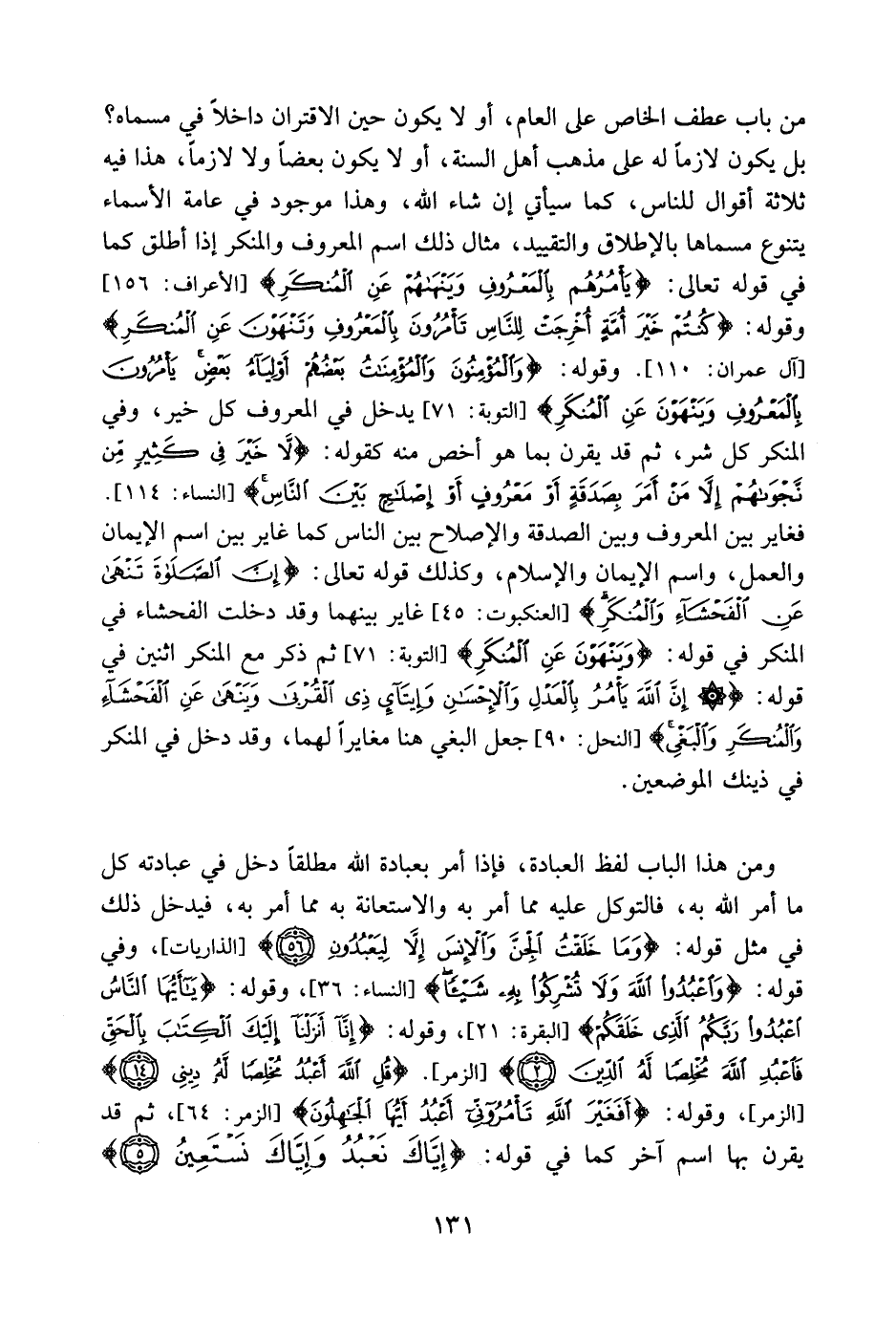 ثم قد يقرن بما هو أخص منه كقوله: {لاَّ خَيْرَ فِي كَثِيرٍ مِّن نَّجْوَاهُمْ إِلاَّ مَنْ أَمَرَ بِصَدَقَةٍ أَوْ مَعْرُوفٍ أَوْ إِصْلاَحٍ بَيْنَ النَّاسِ} [النساء: 114] ، فغاير بين المعروف وبين الصدقة والإصلاح بين الناس كما غاير بين اسم الإيمان والعمل، واسم الإيمان والإسلام وكذلك قوله تعالى: {إِنَّ الصَّلاةَ تَنْهَى عَنِ الْفَحْشَاء} [العنكبوت: 45] ، غاير بينهما وقد دخلت الفحشاء في المنكر في قوله: {وَيَنْهَوْنَ عَنِ الْمُنكَرِ} ثم ذكر مع المنكر اثنين في قوله: {إِنَّ اللهَ يَأْمُرُ بِالْعَدْلِ وَالإِحْسَانِ وَإِيتَاء ذِي الْقُرْبَى وَيَنْهَى عَنِ الْفَحْشَاء وَالْمُنكَرِ وَالْبَغْيِ} [النحل: 90] ، جعل البغي هنا مغايراً لهما، وقد دخل في المنكر في ذينك الموضعين.