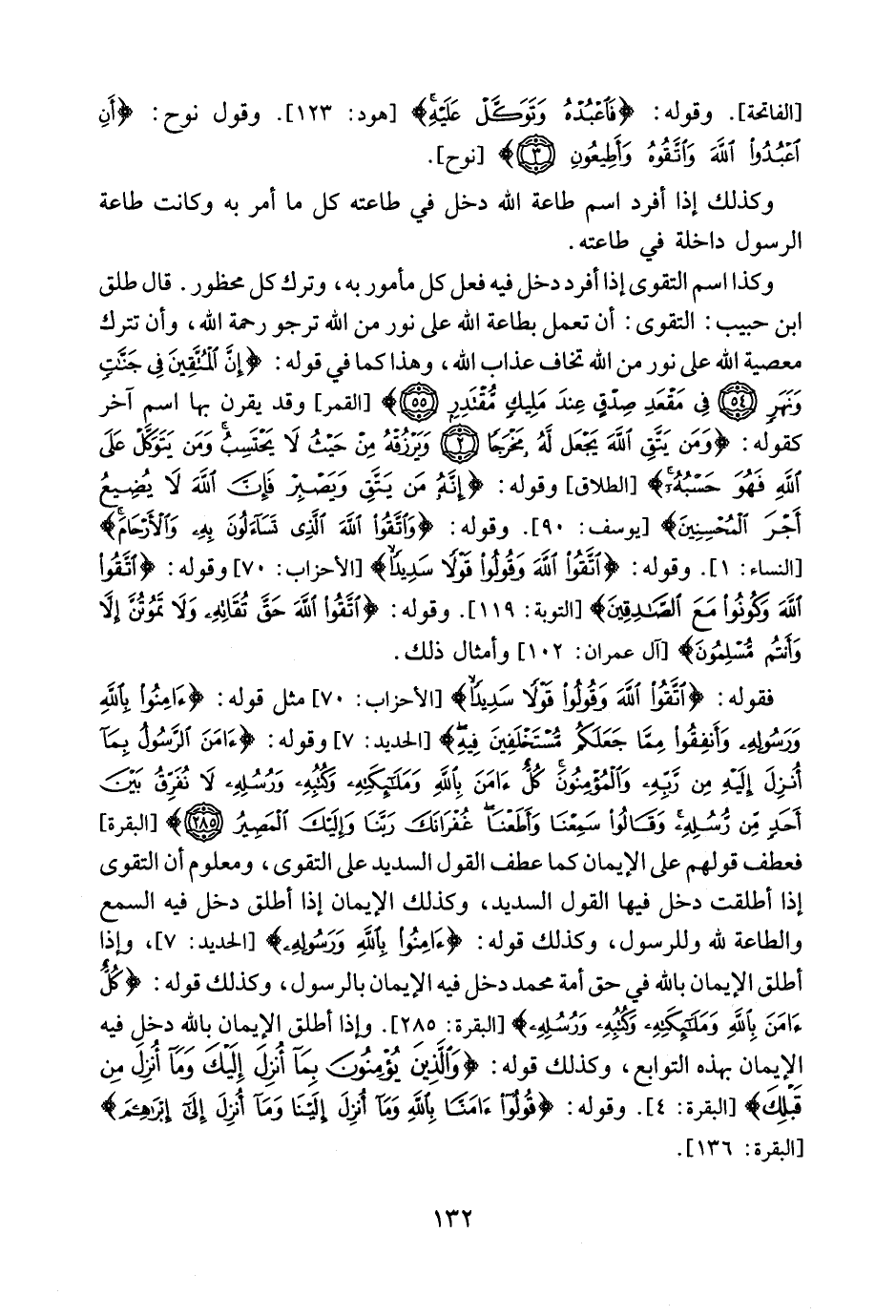 [الفاتحة: 5] ، وقوله: {فَاعْبُدْهُ وَتَوَكَّلْ عَلَيْهِ} [هود: 123] ، وقول نوح: {اعْبُدُوا اللَّهَ وَاتَّقُوهُ وَأَطِيعُونِ} [نوح: 3] ، وكذلك إذا أفرد اسم [طاعة الله] دخل في طاعته كل ما أمر به وكانت طاعة الرسول داخلة في طاعته، وكذا اسم [التقوى] إذا أفرد دخل فيه فعل كل مأمور به وترك كل محظور، قال طَلْقُ بن حبيب: التقوى: أن تعمل بطاعة الله على نور من الله، ترجو رحمة الله، وأن تترك معصية الله على نور من الله، تخاف عذاب الله، وهذا كما في قوله: {إِنَّ الْمُتَّقِينَ فِي جَنَّاتٍ وَنَهَرٍ فِي مَقْعَدِ صِدْقٍ عِندَ مَلِيكٍ مُّقْتَدِرٍ} [القمر: 54، 55] .