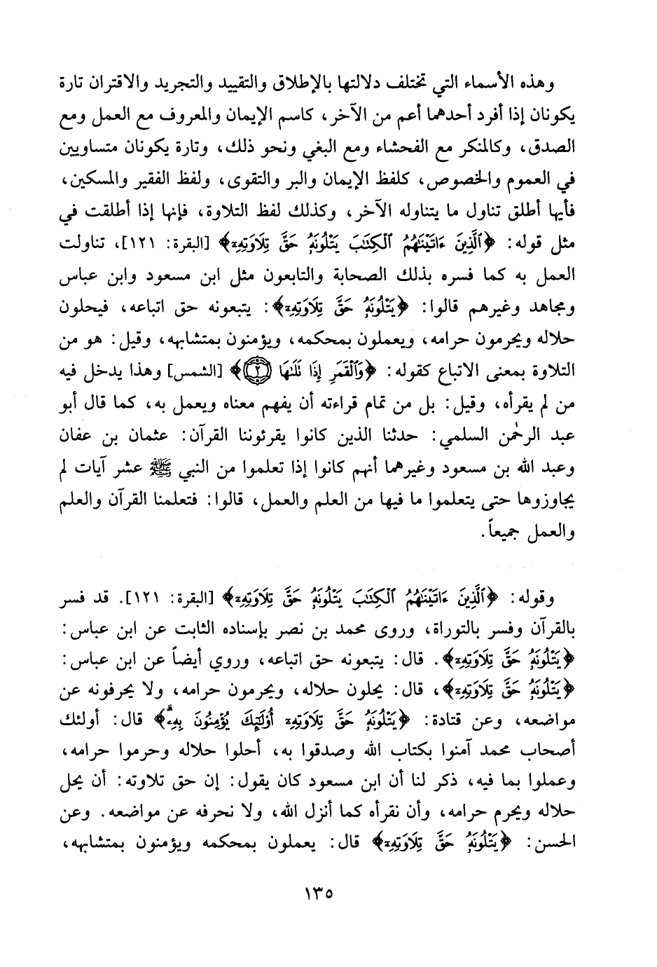 وهذه الأسماء التي تختلف دلالتها بالإطلاق والتقييد والتجريد والاقتران، تارة يكونان إذا أفرد أحدهما أعم من الآخر، كاسم [الإيمان] و [المعروف] مع العمل ومع الصدق، وك [المنكر] مع الفحشاء ومع البغي ونحو ذلك. وتارة يكونان متساويين في العموم والخصوص، كلفظ [الإيمان] ، و [البر] ، و [التقوى] ، ولفظ [الفقير] ، و [المسكين] . فأيها أطلق تناول ما يتناوله الآخر، وكذلك لفظ [التلاوة] ، فإنها إذا أطلقت في مثل قوله: {الَّذِينَ آتَيْنَاهُمُ الْكِتَابَ يَتْلُونَهُ حَقَّ تِلاَوَتِهِ} [البقرة: 121] ، تناولت العمل به كما فسره بذلك الصحابة والتابعون مثل ابن مسعود وابن عباس ومجاهد وغيرهم، قالوا: {يَتْلُونَهُ حَقَّ تِلاَوَتِهِ} يتبعونه حق اتباعه، فيحلون حلاله ويحرمون حرامه، ويعملون بمحكمه ويؤمنون بمتشابهه، وقيل: هو من التلاوة بمعنى الاتباع، كقوله: {وَالْقَمَرِ إِذَا تَلَاهَا} [الشمس: 2] ، وهذا يدخل فيه من لم يقرأه، بل من تمام قراءته أن يفهم معناه ويعمل به، كما قال أبو عبد الرحمن السلمي: حدثنا الذين كانوا يقرئوننا القرآن: عثمان ابن عفان، وعبد الله بن مسعود، وغيرهما أنهم كانوا إذا تَعَلَّموا من النبي صلى الله عليه وسلم عشر آيات لم يجاوزوها حتى يتعلموا ما فيها من العلم والعمل، قالوا: فتعلمنا القرآن والعلم والعمل جميعاً.