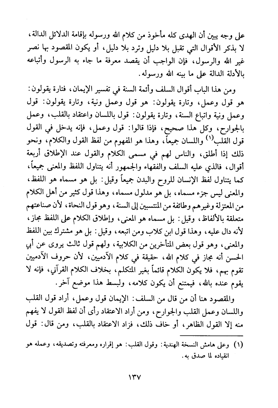 ومن هذا الباب أقوال السلف وأئمة السنة في [تفسير الإيمان] ، فتارة يقولون: هو قول وعمل. وتارة يقولون: هو قول وعمل ونية. وتارة يقولون قول وعمل ونية واتباع السنة. وتارة يقولون: قول باللسان، واعتقاد بالقلب وعمل بالجوارح، وكل هذا صحيح. فإذا قالوا: قول وعمل؛ فإنه يدخل في القول قول القلب واللسان جميعاً، وهذا هو المفهوم من لفظ القول والكلام، ونحو ذلك إذا أطلق.