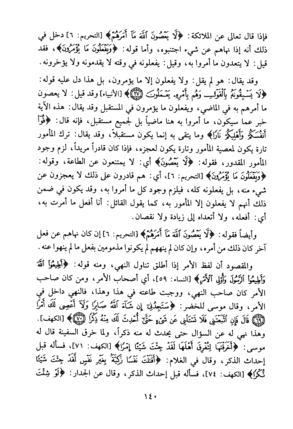 وقد يقال: هو لم يقل: ولا يفعلون إلا ما يؤمرون، بل هذا دل عليه قوله: {لا يَسْبِقُونَهُ بِالْقَوْلِ وَهُم بِأَمْرِهِ يَعْمَلُونَ} [الأنبياء: 27] ، وقد قيل: لا يعصون ما أمرهم به في الماضي، ويفعلون ما يؤمرون في المستقبل. وقد يقال: هذه الآية خبر عما سيكون، ليس ما أمروا به هنا ماضياً بل الجميع مستقبل، فإنه قال: {قُوا أَنفُسَكُمْ وَأَهْلِيكُمْ نَارًا} [التحريم: 6] ، وما يتقي به إنما يكون مستقبلاً، وقد يقال: ترك المأمور تارة يكون لمعصية الآمر وتارة يكون لعجزه، فإذا كان قادراً مريداً، لزم وجود المأمور المقدور، فقوله: {لا يَعْصُونَ} لا يمتنعون عن الطاعة، وقوله: {وَيَفْعَلُونَ مَا يُؤْمَرُونَ} أي: هم قادرون على ذلك لا يعجزون عن شيء منه بل يفعلونه كله، فيلزم وجود كل ما أمروا به، وقد يكون في ضمن ذلك أنهم لا يفعلون إلا المأمور به، كما يقول القائل: أنا أفعل ما أمرت به، أي: أفعله ولا أتعداه إلى زيادة ولا نقصان.