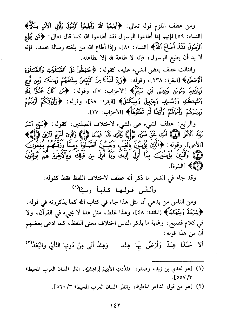 والرابع: عطف الشيء على الشيء لاختلاف الصفتين، كقوله: {سَبِّحِ اسْمَ رَبِّكَ الأَعْلَى الَّذِي خَلَقَ فَسَوَّى وَالَّذِي قَدَّرَ فَهَدَى وَالَّذِي أَخْرَجَ الْمَرْعَى} [الأعلى: 1: 4] . وقوله: {الَّذِينَ يُؤْمِنُونَ بِالْغَيْبِ وَيُقِيمُونَ الصَّلاةَ وَمِمَّا رَزَقْنَاهُمْ يُنفِقُونَ والَّذِينَ يُؤْمِنُونَ بِمَا أُنزِلَ إِلَيْكَ وَمَا أُنزِلَ مِن قَبْلِكَ وَبِالآخِرَةِ هُمْ يُوقِنُونَ} [البقرة: 3، 4] ، وقد جاء في الشعر ما ذكر أنه عطف لاختلاف اللفظ فقط كقوله:
