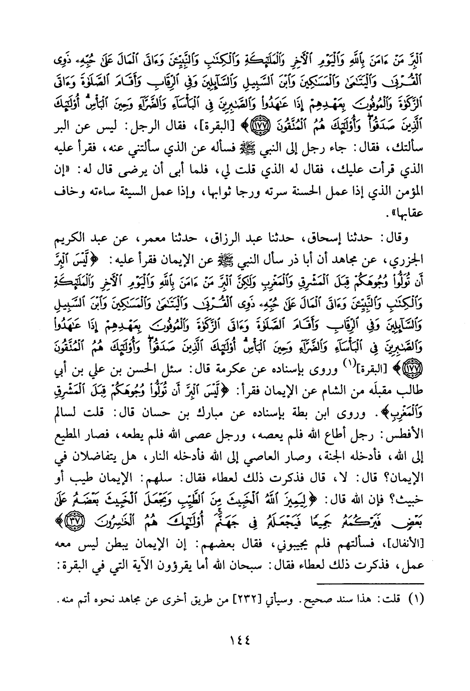 وقال: حدثنا إسحاق، حدثنا عبد الرزاق، حدثنا مَعْمَر، عن عبد الكريم الجَزَرِي، عن مجاهد؛ أن أبا ذر سأل النبي صلى الله عليه وسلم عن الإيمان، فقرأ عليه: {لَّيْسَ الْبِرَّ أَن تُوَلُّواْ وُجُوهَكُمْ} إلى آخر الآية، وروى بإسناده عن عِكْرِمَة قال: سئل الحسن بن علي بن أبي طالب مقبله من الشام عن الإيمان فقرأ: {لَّيْسَ الْبِرَّ أَن تُوَلُّواْ وُجُوهَكُمْ قِبَلَ الْمَشْرِقِ وَالْمَغْرِبِ} ، وروى ابن بطة بإسناده عن مبارك بن حسان قال: قلت لسالم الأفطس: رجل أطاع الله فلم يعصه، ورجل عصى الله فلم يطعه، فصار المطيع إلى الله فأدخله الجنة، وصار العاصي إلى الله فأدخله النار، هل يتفاضلان في الإيمان؟ قال: لا. قال: فذكرت ذلك لعطاء فقال: سلهم: الإيمان طيب أو خبيث؟ فإن الله قال: {لِيَمِيزَ اللهُ الْخَبِيثَ مِنَ الطَّيِّبِ وَيَجْعَلَ الْخَبِيثَ بَعْضَهُ عَلَىَ بَعْضٍ فَيَرْكُمَهُ جَمِيعاً فَيَجْعَلَهُ فِي جَهَنَّمَ أُوْلَئِكَ هُمُ الْخَاسِرُونَ} [الأنفال: 37] ، فَسألتهم فلم يجيبوني، فقال بعضهم: إن الإيمان يبطن ليس معه عمل، فذكرت ذلك لعطاء فقال: سبحان الله! أما يقرؤون الآية التي في البقرة: