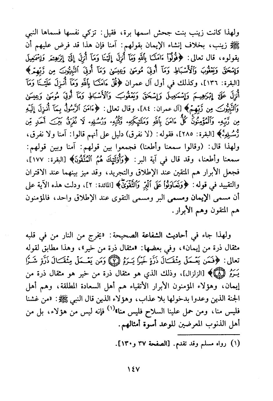 ولهذا جاء في أحاديث الشفاعة الصحيحة: " يخرج من النار من في قلبه مِثْقَال ذَرَّةٍ من إيمان "، وفي بعضها: " مثقال ذرة من خير "، وهذا مطابق لقوله تعالى: {فَمَن يَعْمَلْ مِثْقَالَ ذَرَّةٍ خَيْرًا يَرَهُ وَمَن يَعْمَلْ مِثْقَالَ ذَرَّةٍ شَرًّا يَرَهُ} [الزلزلة: 7، 8] ، وذلك الذي هو مثقال ذرة من خير هو مثقال ذرة من إيمان، وهؤلاء المؤمنون الأبرار الأتقياء هم أهل السعادة المطلقة، وهم أهل الجنة الذين وعدوا بدخولها بلا عذاب، وهؤلاء الذين قال النبي صلى الله عليه وسلم: " من غَشَّنَا فليس مِنَّا، ومن حَمَل علينا السِّلاحَ فليس منا " فإنه ليس من هؤلاء، بل من أهل الذنوب المعرضين للوعيد أسوة أمثالهم.