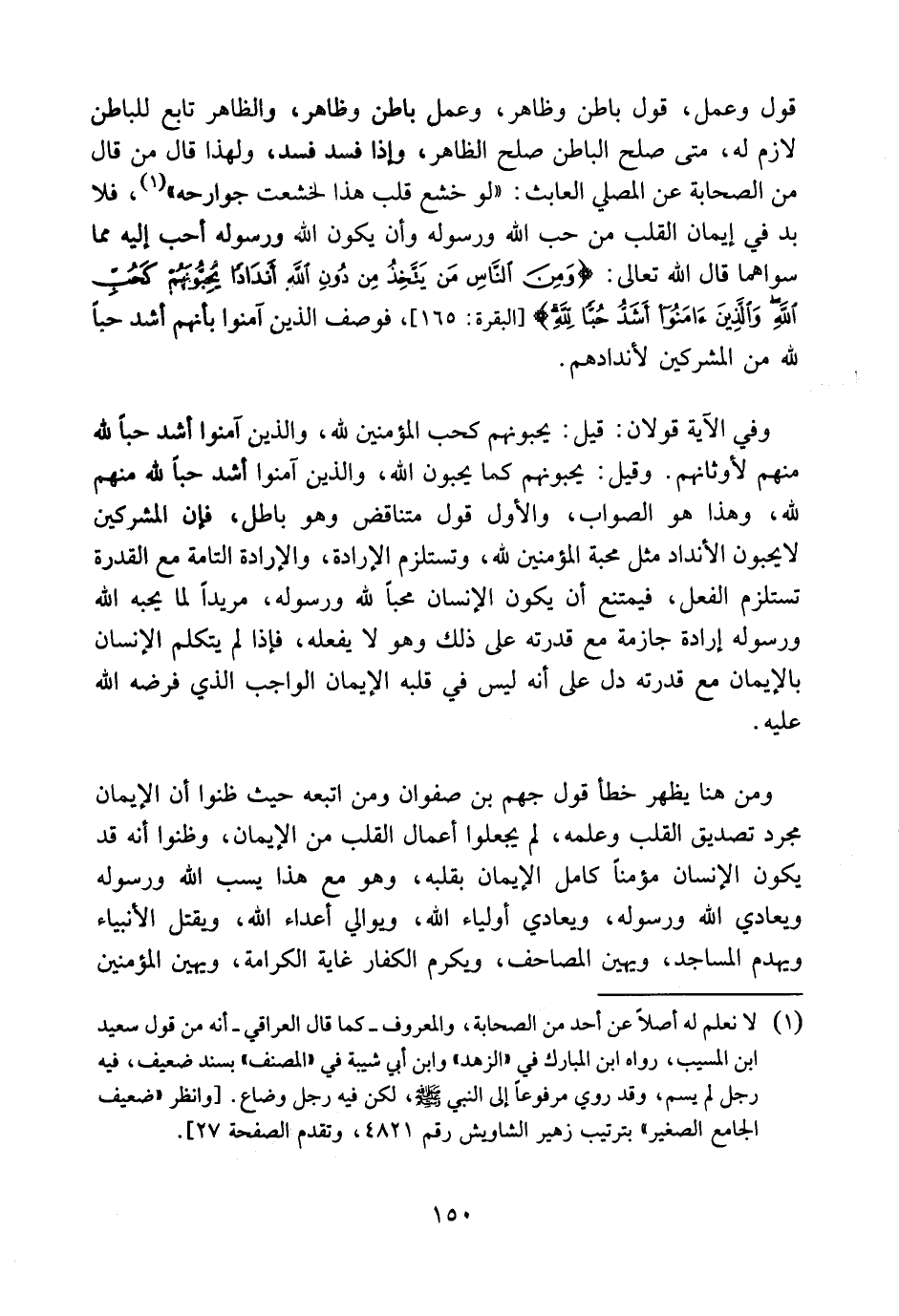 ومن هنا يظهر خطأ قول جَهْم بن صَفْوان ومن اتبعه، حيث ظنوا أن الإيمان مجرد تصديق القلب وعلمه، لم يجعلوا أعمال القلب من الإيمان، وظنوا أنه قد يكون الإنسان مؤمناً كامل الإيمان بقلبه، وهو مع هذا يسب الله ورسوله، ويعادي الله ورسوله، ويعادي أولياء الله، ويوالي أعداء الله، ويقتل الأنبياء، ويهدم المساجد، ويهين المصاحف، ويكرم الكفار غاية الكرامة، ويهين المؤمنين