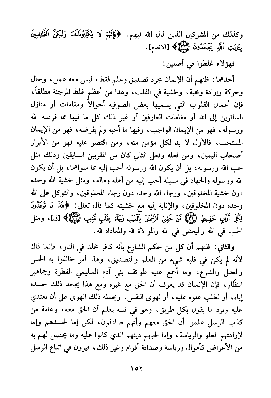 أحدهما: ظنهم أن الإيمان مجرد تصديق وعلم فقط، ليس معه عمل، وحال، وحركة، وإرادة، ومحبة، وخشية في القلب، وهذا من أعظم غلط المرجئة مطلقًا، فإن [أعمال القلوب] التي يسميها بعض الصوفية أحوالاً ومقامات أو منازل السائرين إلى الله أو مقامات العارفين أو غير ذلك، كل ما فيها مما فرضه الله ورسوله فهو من الإيمان الواجب، وفيها ما أحبه ولم يفرضه، فهو من الإيمان المستحب، فالأول لابد لكل مؤمن منه، ومن اقتصر عليه فهو من الأبرار أصحاب اليمين، ومن فعله وفعل الثاني كان من المقربين السابقين، وذلك مثل حب الله ورسوله، بل أن يكون الله ورسوله أحب إليه مما سواهما، بل أن يكون الله ورسوله والجهاد في سبيله أحب إليه من أهله وماله، ومثل خشية الله وحده دون خشية المخلوقين، ورجاء الله وحده دون رجاء المخلوقين، والتوكل علي الله وحده دون المخلوقين، والإنابة إليهمع خشيته، كما قال تعالى: {هَذَا مَا تُوعَدُونَ لِكُلِّ أَوَّابٍ حَفِيظٍ مَنْ خَشِيَ الرَّحْمَن بِالْغَيْبِ وَجَاء بِقَلْبٍ مُّنِيبٍ} [ق: 32، 33] ، ومثل الحب في الله والبغض في الله والموالاة لله والمعاداة لله.
