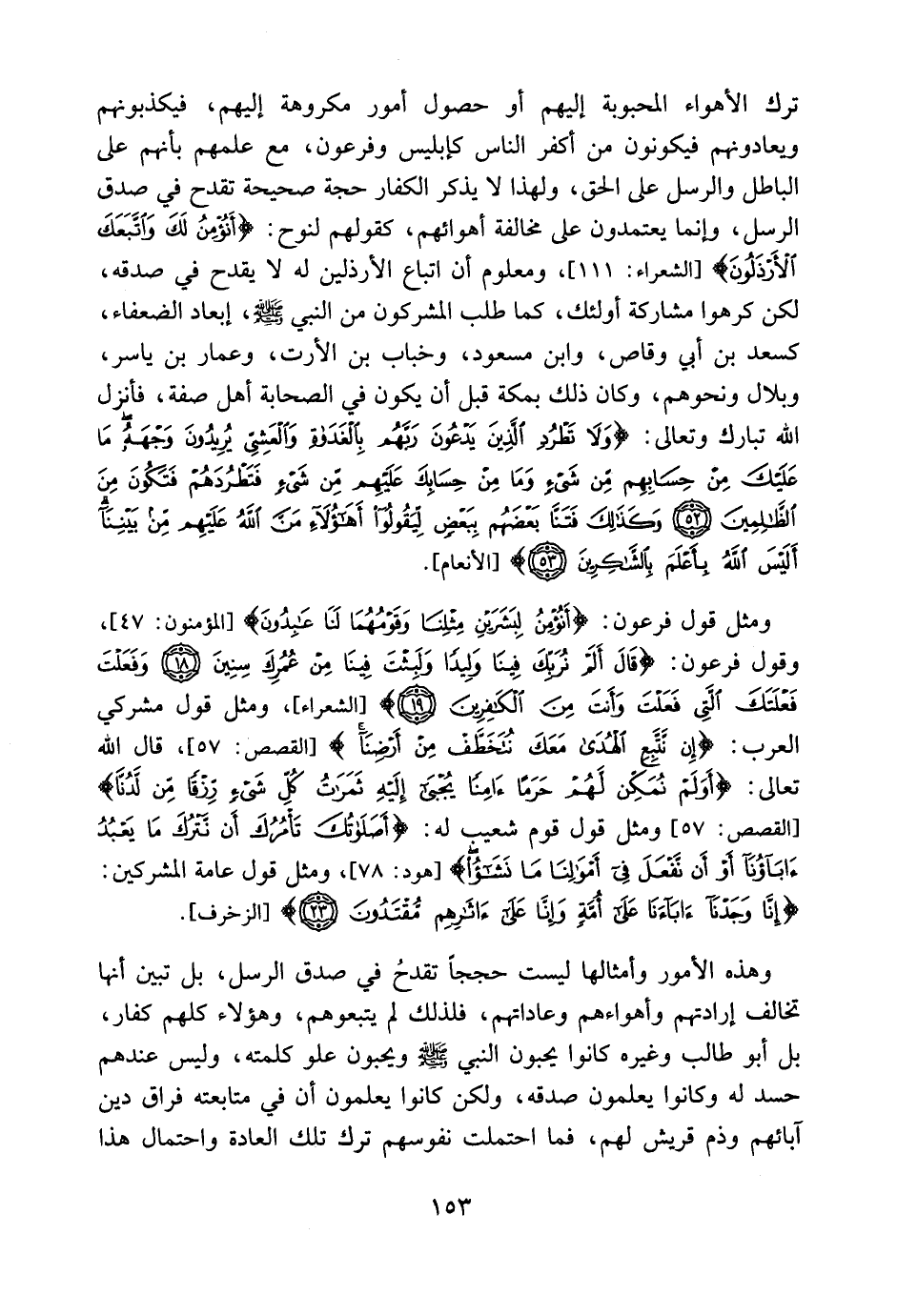 ومثل قول فرعون: {أَنُؤْمِنُ لِبَشَرَيْنِ مِثْلِنَا وَقَوْمُهُمَا لَنَا عَابِدُونَ} [المؤمنون: 47] ، وقول فرعون: {أَلَمْ نُرَبِّكَ فِينَا وَلِيدًا وَلَبِثْتَ فِينَا مِنْ عُمُرِكَ سِنِينَ وَفَعَلْتَ فَعْلَتَكَ الَّتِي فَعَلْتَ وَأَنتَ مِنَ الْكَافِرِينَ} [الشعراء: 18، 19] ، ومثل قول مشركي العرب: {إِن نَّتَّبِعِ الْهُدَى مَعَكَ نُتَخَطَّفْ مِنْ أَرْضِنَا} قال الله تعالى: {أَوَلَمْ نُمَكِّن لَّهُمْ حَرَمًا آمِنًا يُجْبَى إِلَيْهِ ثَمَرَاتُ كُلِّ شَيْءٍ رِزْقًا مِن لَّدُنَّا} [القصص: 57] ، ومثل قول قوم شعيب له: {أَصَلاَتُكَ تَأْمُرُكَ أَن نَّتْرُكَ مَا يَعْبُدُ آبَاؤُنَا أَوْ أَن نَّفْعَلَ فِي أَمْوَالِنَا مَا نَشَاء} [هود: 87] ومثل قول عامة المشركين: {إِنَّا وَجَدْنَا آبَاءنَا عَلَى أُمَّةٍ وَإِنَّا عَلَى آثَارِهِم مُّقْتَدُونَ} [الزخرف: 23] .